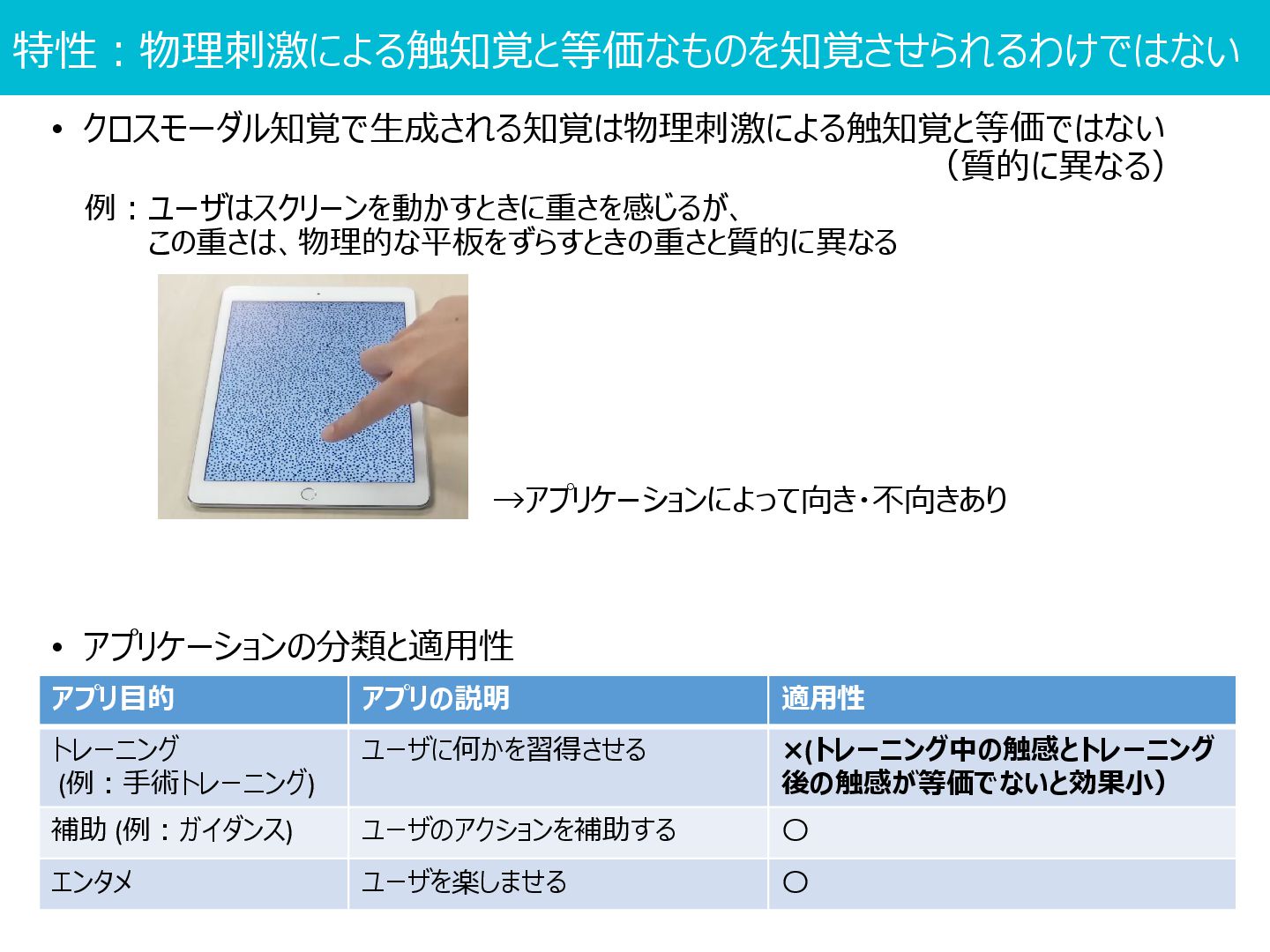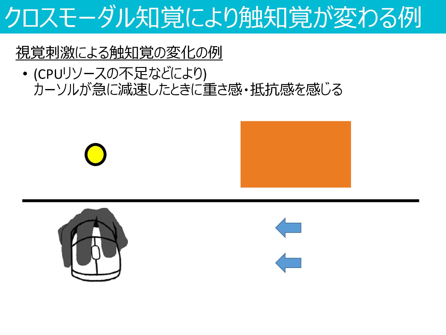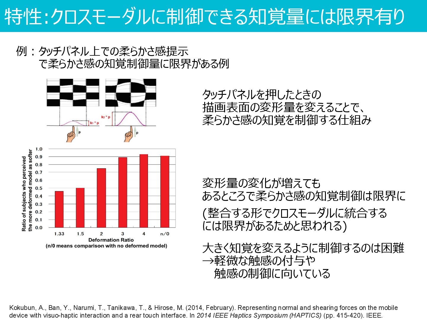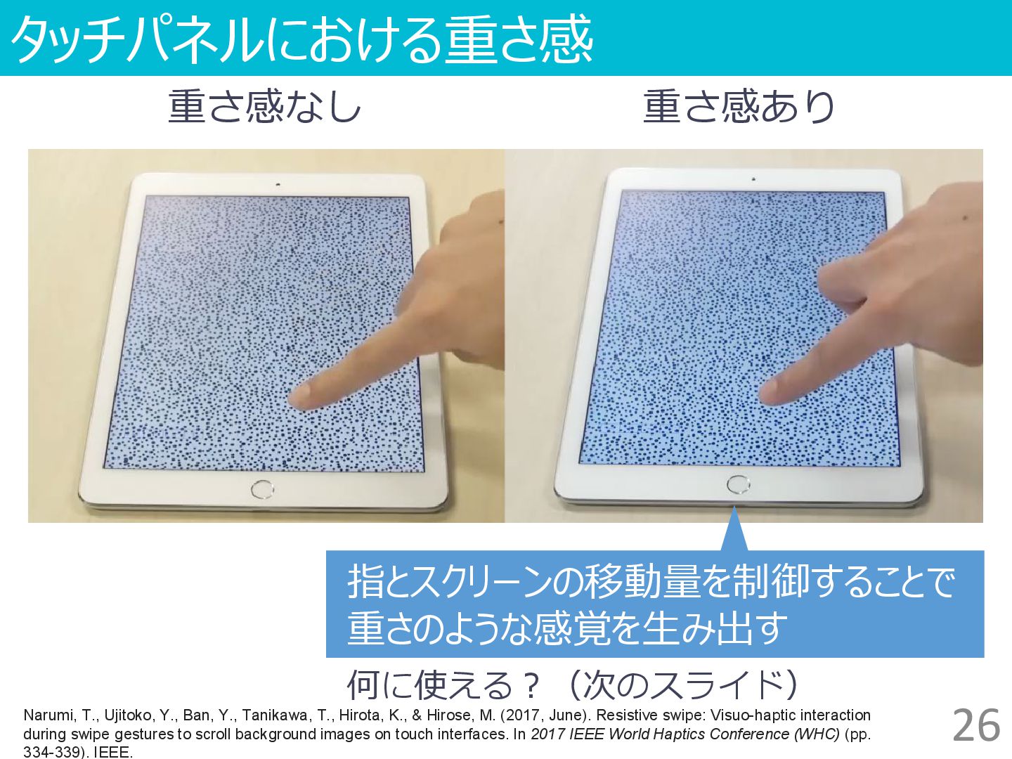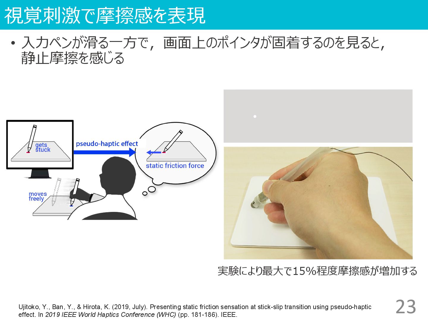 Hirota, K. (2019, July). Presenting static friction sensation at stick-slip transition using pseudo-haptic effect. In 2019 IEEE World Haptics Conference (WHC) (pp. 181-186). IEEE. 実験により最大で15%程度摩擦感が増加する