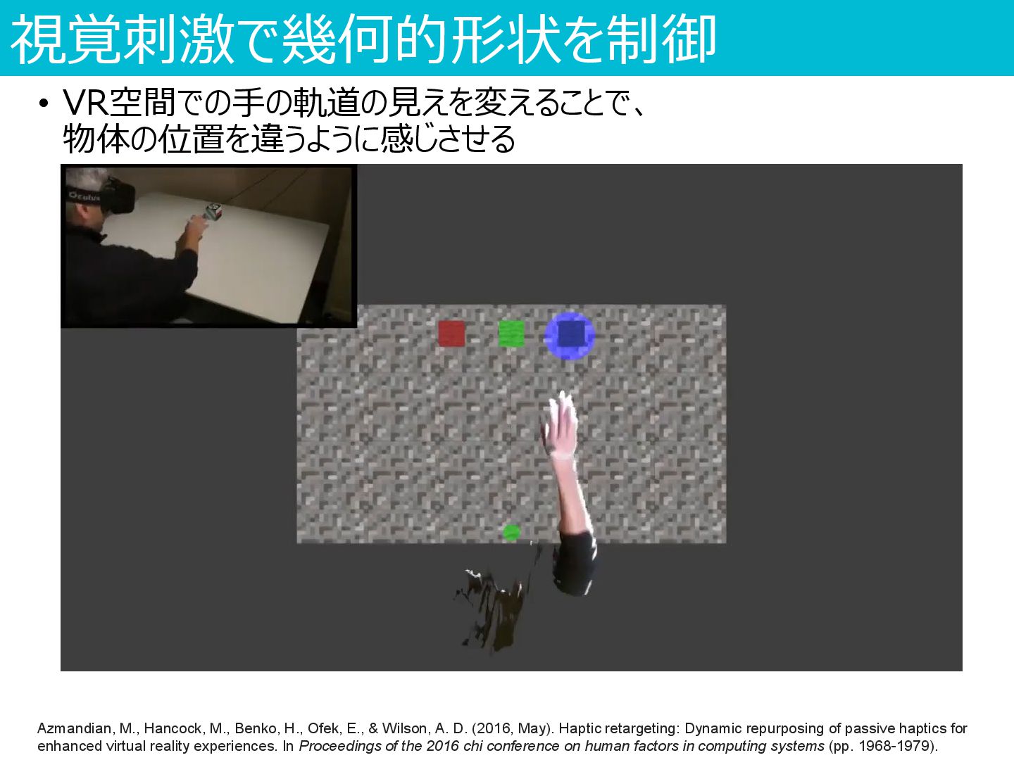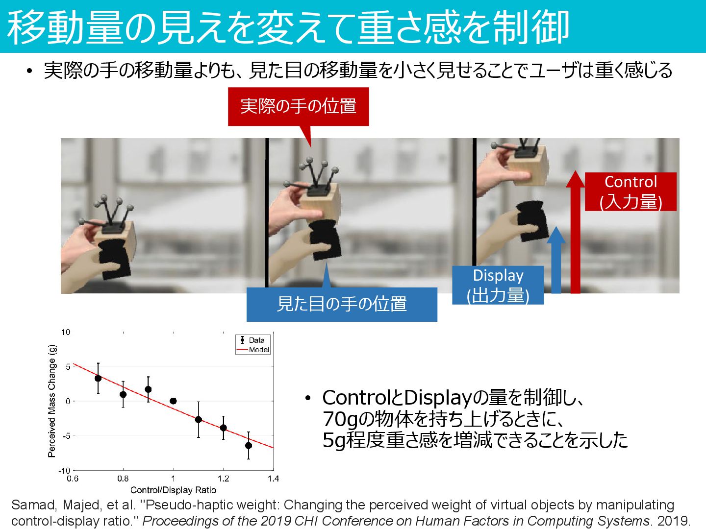 the perceived weight of virtual objects by manipulating control-display ratio." Proceedings of the 2019 CHI Conference on Human Factors in Computing Systems. 2019. 実際の手の位置 見た目の手の位置 Control (入力量) Display (出力量) • ControlとDisplayの量を制御し、 70gの物体を持ち上げるときに、 5g程度重さ感を増減できることを示した