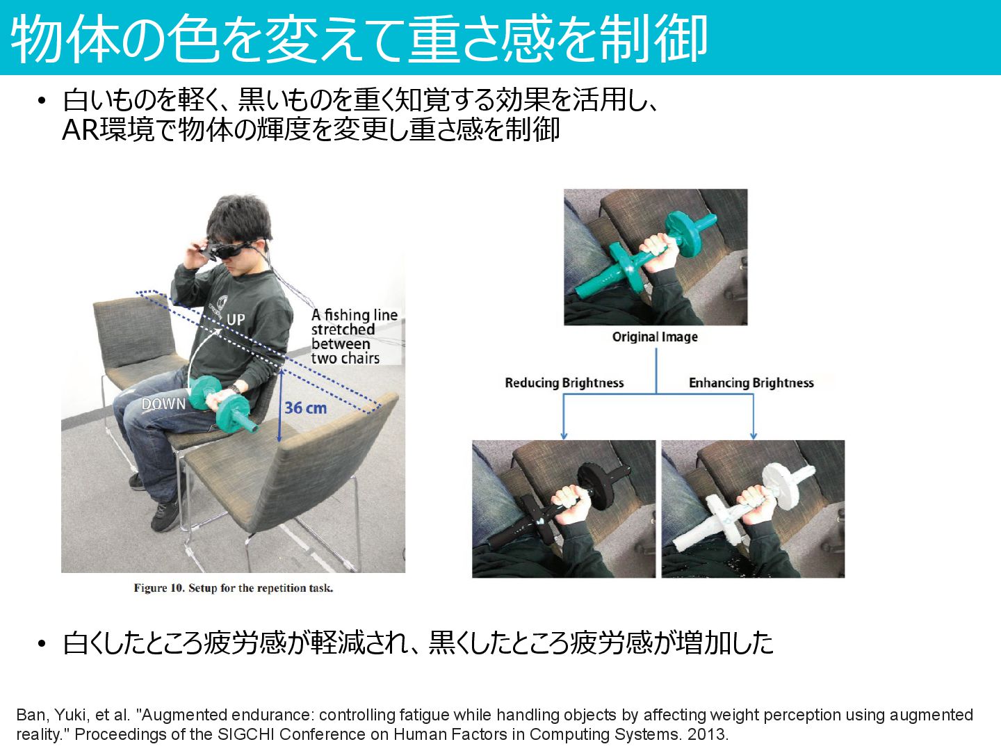 controlling fatigue while handling objects by affecting weight perception using augmented reality." Proceedings of the SIGCHI Conference on Human Factors in Computing Systems. 2013. • 白くしたところ疲労感が軽減され、黒くしたところ疲労感が増加した