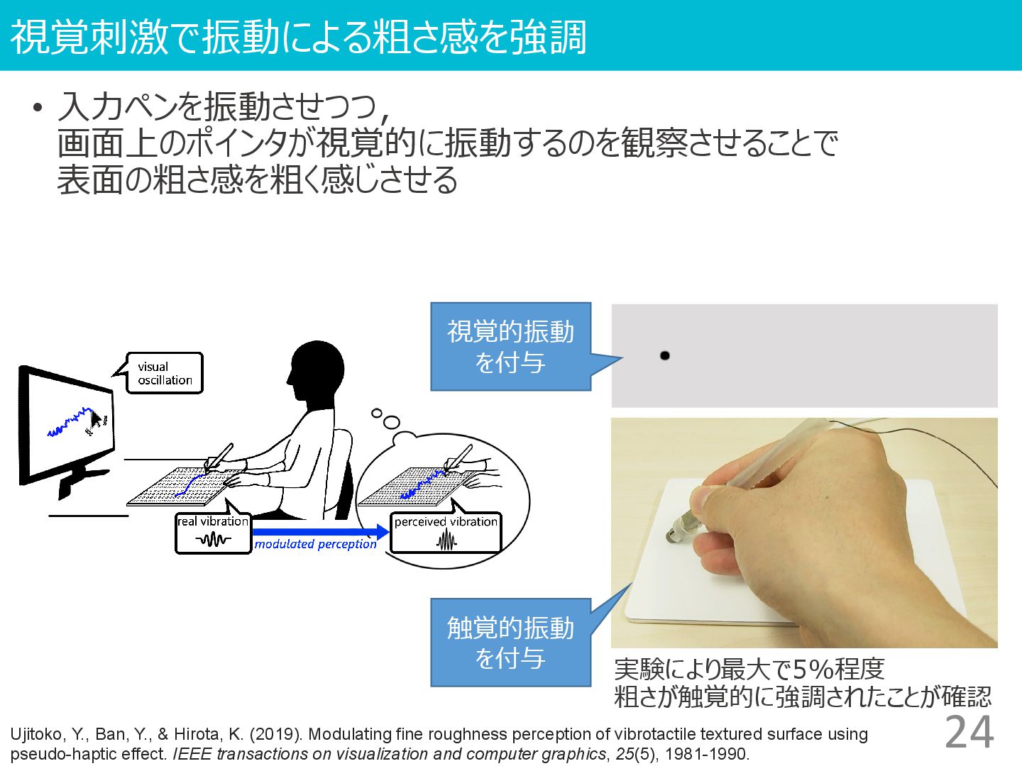 実験により最大で5%程度 粗さが触覚的に強調されたことが確認 Ujitoko, Y., Ban, Y., & Hirota, K. (2019). Modulating fine roughness perception of vibrotactile textured surface using pseudo-haptic effect. IEEE transactions on visualization and computer graphics, 25(5), 1981-1990.