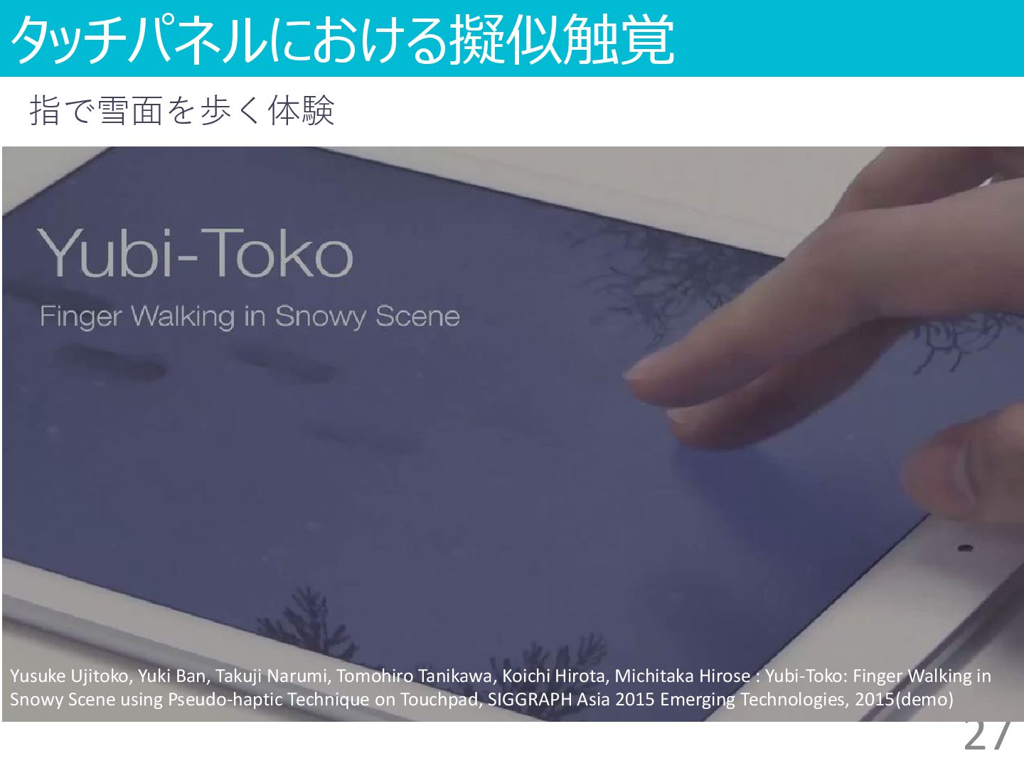 Tanikawa, Koichi Hirota, Michitaka Hirose : Yubi-Toko: Finger Walking in Snowy Scene using Pseudo-haptic Technique on Touchpad, SIGGRAPH Asia 2015 Emerging Technologies, 2015(demo)