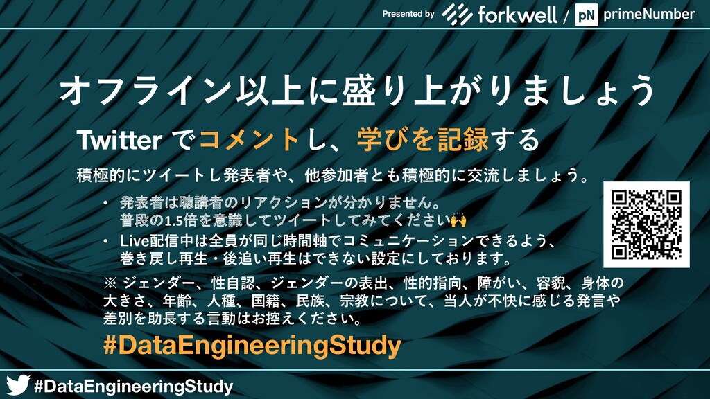 オフライン以上に盛り上がりましょう #DataEngineeringStudy / Twitter でコメントし、学びを記録する 積極的にツイートし発表者や、他参加者とも積極的に交流しましょう。 • 発表者は聴講者のリアクションが分かりません。 普段の1.5倍を意識してツイートしてみてください🙌 •