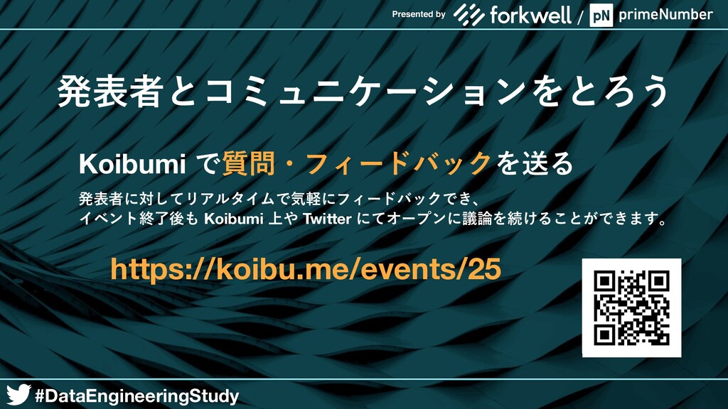 発表者とコミュニケーションをとろう #DataEngineeringStudy / Koibumi で質問・フィードバックを送る 発表者に対してリアルタイムで気軽にフィードバックでき、 イベント終了後も Koibumi 上や Twitter