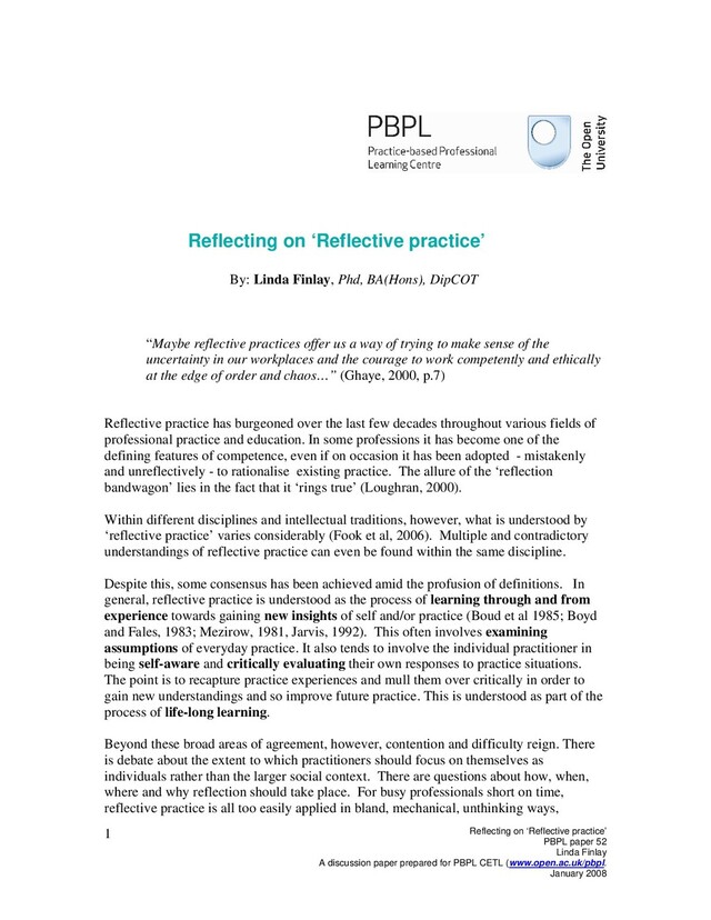 of the literature. Journal of Advanced Nursing, 18, 1188-92. Boud, D. and Fales, A. (1983) Reflective learning: key to learning from experience. Journal of Humanistic Psychology, 23(2), 99-117. Boud, D., Keogh, R. and Walker, D. (1985) Promoting reflection in learning: a model. In D. Boud, R. Keogh and D. Walker (eds.) Reflection: turning experience into learning. London: Kogan Page. Boud, D. and Walker, D. (1998) Promoting reflection in professionals courses: the challenge of context. Studies in Higher Education, 23(2), 191-206. Brookfield, S. (1990) Using critical incidents to explore learners’ assumptions, in J.Mezirow (ed.) Fostering critical reflection in adulthood. San Francisco: Jossey-Bass. Brookfield, S. (1991) On ideology, pillage, language and risk: critical thinking and the tensions of critical practice. Studies in Continuing Eduation, 13(1), 1-14. Brookfield, S. (1994) Tales from the dark side: a phenomenography of adult critical reflection. International Journal of Lifelong Education, 13(3), 203-216. Brookfield, S. (1995) Becoming a Critically Reflective Teacher. San Francisco: Jossey-Bass. Burrows, D.E. (1995) the nurse teacher’s role in the promotion of reflective practice. Nurse Education Today, 15, 346-350. Cameron, B. and Mitchell, A. (1993) Reflective peer journals. Journal of Advanced Nursing, 18, 290-297. Christie, D. and Kirkwood, M. (2006) The new standards framework for Scottish teachers: facilitating or constraining reflective practice? Reflective Practice, 7(2), 265-276. Dewey, J. (1933) How we think: a restatement of the relation of reflective thinking to the educative proces. Chicago IL: Henry Regnery Co. Eby, M.A. (2000) Understanding professional development. In A. Brechin, H. Brown and M.A. Eby(eds.) Critical practice in health and social care. London: Sage. Ekebergh, M. (2007) Lifeworld-based reflection and learning: a contribution to the reflective practice in nursing and nursing education. Reflective Practice, 8(3), 331-343. Eraut, M. (2004) Editorial: the practice of reflection. Learning in Health and Social Care, 3(2), 47-52. Finlay, L. and Gough, B. (2003) Reflexivity: a practical guide for researchers in health and social sciences. Oxford: Blackwell Publishing. Finlay, L. (2002) Negotiating the swamp: the opportunity and challenge of reflexivity in research practice. Qualitative Research, 2(2), 209-230. Finlay, L. (2003) Mapping multiple routes. In L.Finlay and B. Gough (eds.) Reflexivity: a practical guide for researchers in health and social sciences. Oxford: Blackwell Publishing. Fish, D. and Coles, C. (1998) Professionalism eroded: professionals under siege. In D Fish and C. Coles (eds.) Developing professional judgement in health care: learning through the critical appreciation of practice. Oxford: Butterworth-Heinemann. Fook, J. (2006) Beyond reflective practice: reworking the “critical” in critical reflection. Keynote speech for conference “Professional lifelong learning: beyond reflective practice”, July 3.