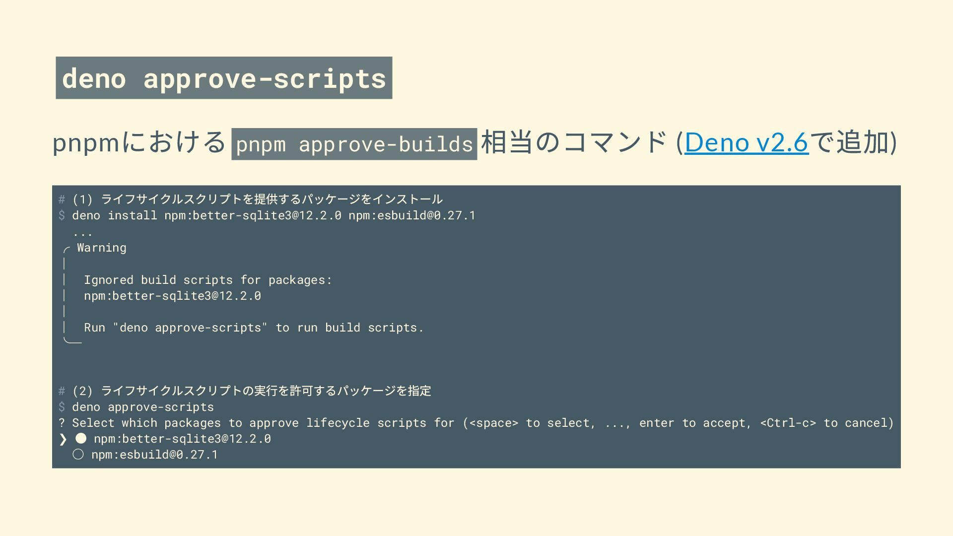 [email protected] │ │ Run "deno approve-scripts" to run build scripts. ╰─ # (2) ライフサイクルスクリプトの実行を許可するパッケージを指定 $ deno approve-scripts ? Select which packages to approve lifecycle scripts for (<space> to select, ..., enter to accept, <Ctrl-c> to cancel) ❯ • npm: