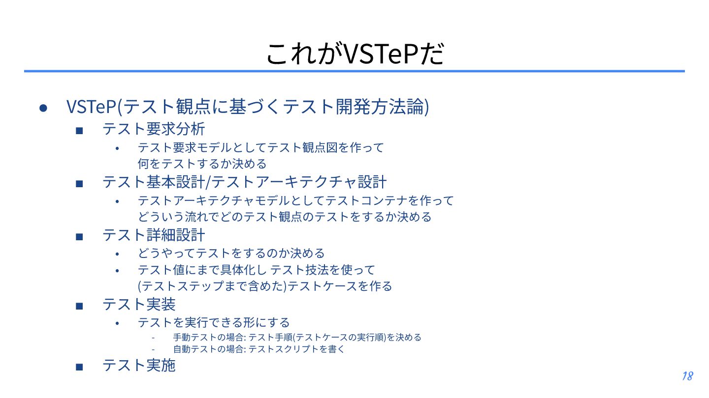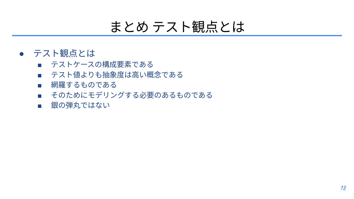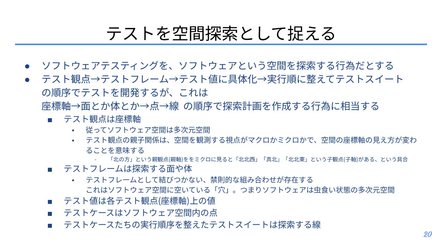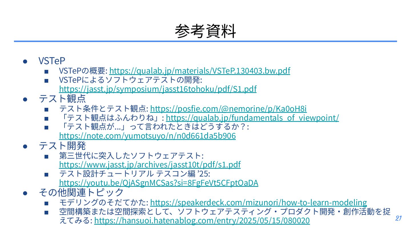 テスト観点 ▪ テスト条件とテスト観点: https://posfie.com/@nemorine/p/Ka0oH8i ▪ 「テスト観点はふんわりね」: https://qualab.jp/fundamentals_of_viewpoint/ ▪ 「テスト観点が...」って⾔われたときはどうするか?: https://note.com/yumotsuyo/n/n0d661da5b906 • テスト開発 ▪ 第三世代に突⼊したソフトウェアテスト: https://www.jasst.jp/archives/jasst10t/pdf/s1.pdf ▪ テスト設計チュートリアル テスコン編 ’25: https://youtu.be/QjASgnMCSas?si=8FgFeVt5CFptOaDA • その他関連トピック ▪ モデリングのそだてかた: https://speakerdeck.com/mizunori/how-to-learn-modeling ▪ 空間構築または空間探索として、ソフトウェアテスティング‧プロダクト開発‧創作活動を捉 えてみる: https://hansuoi.hatenablog.com/entry/2025/05/15/080020 21