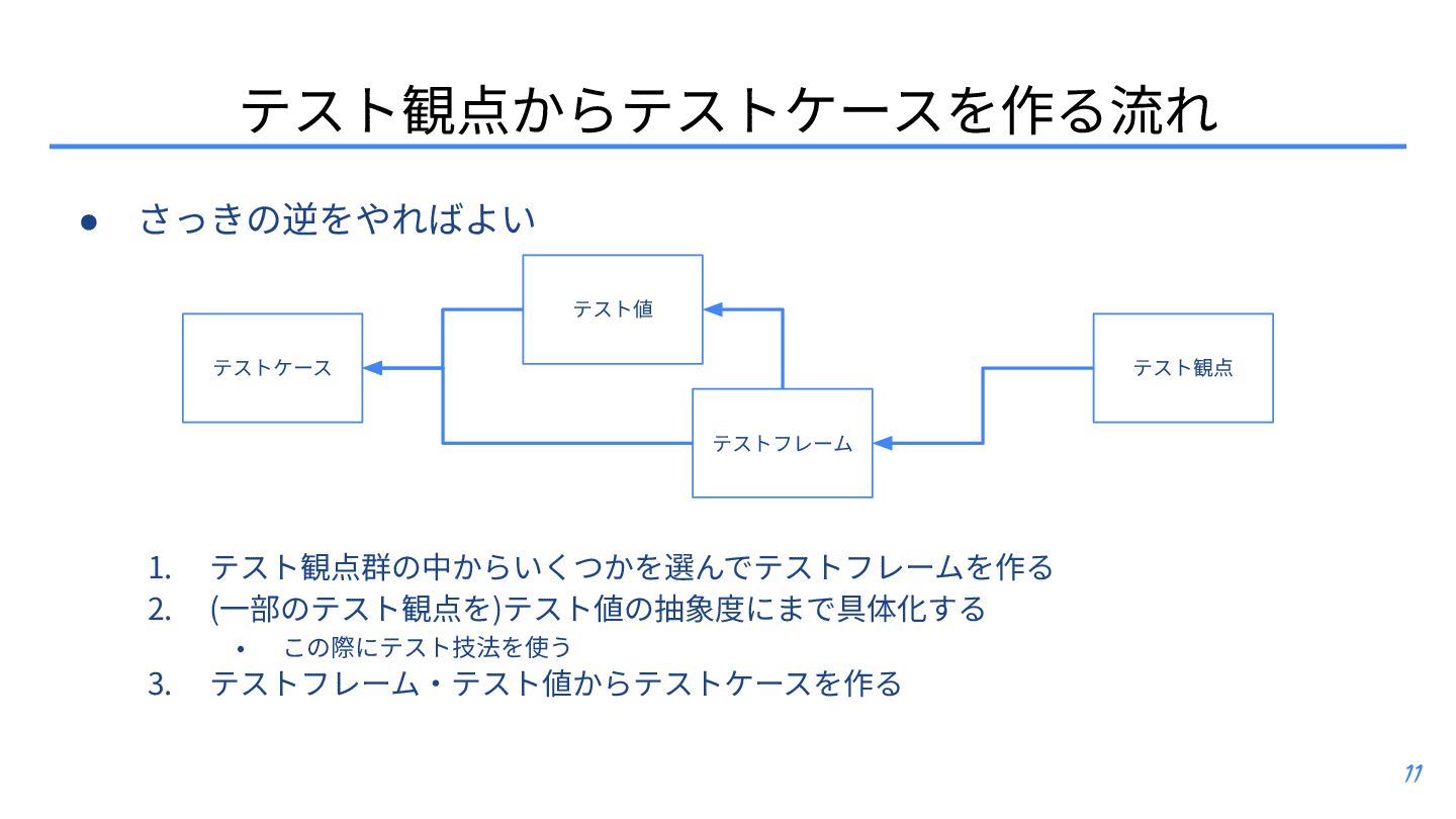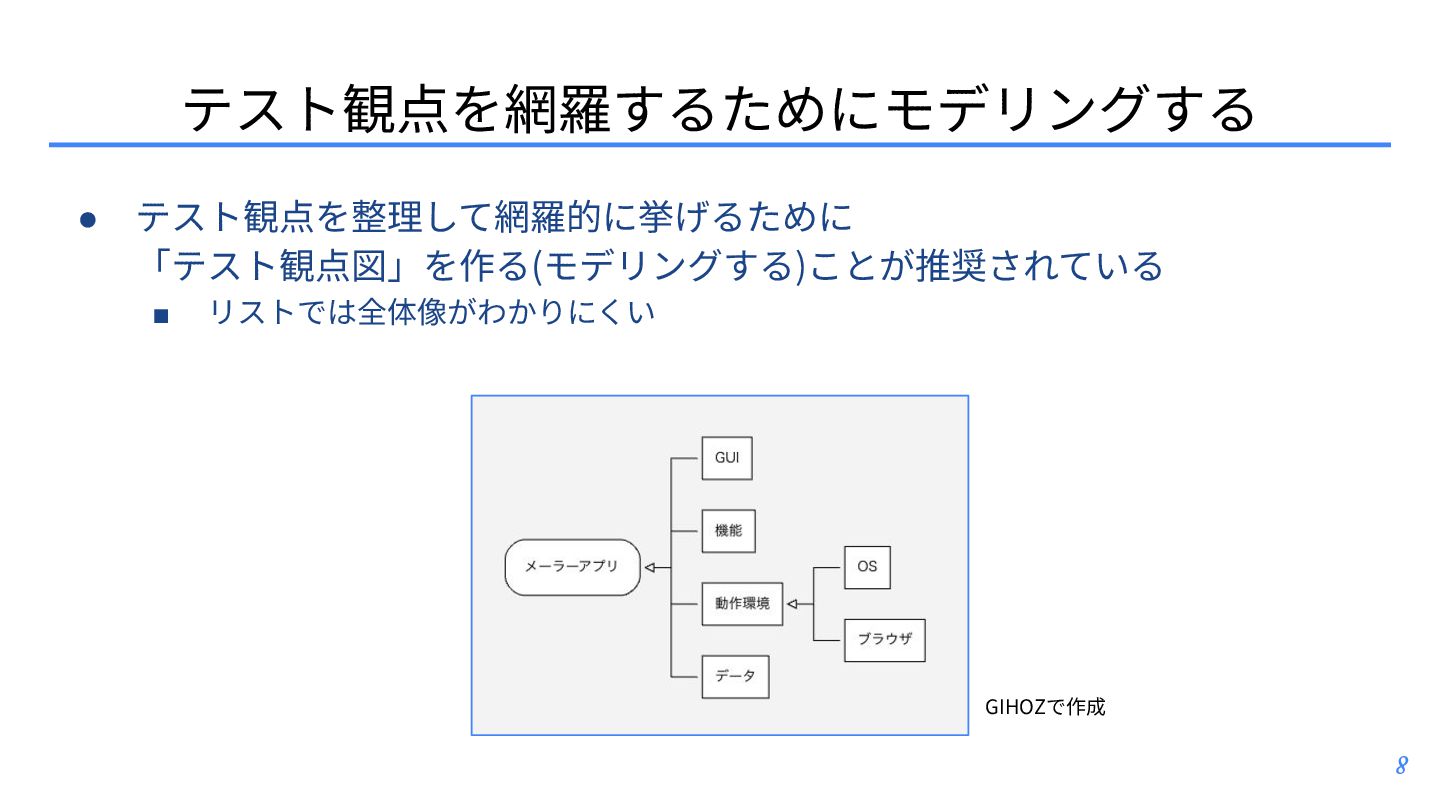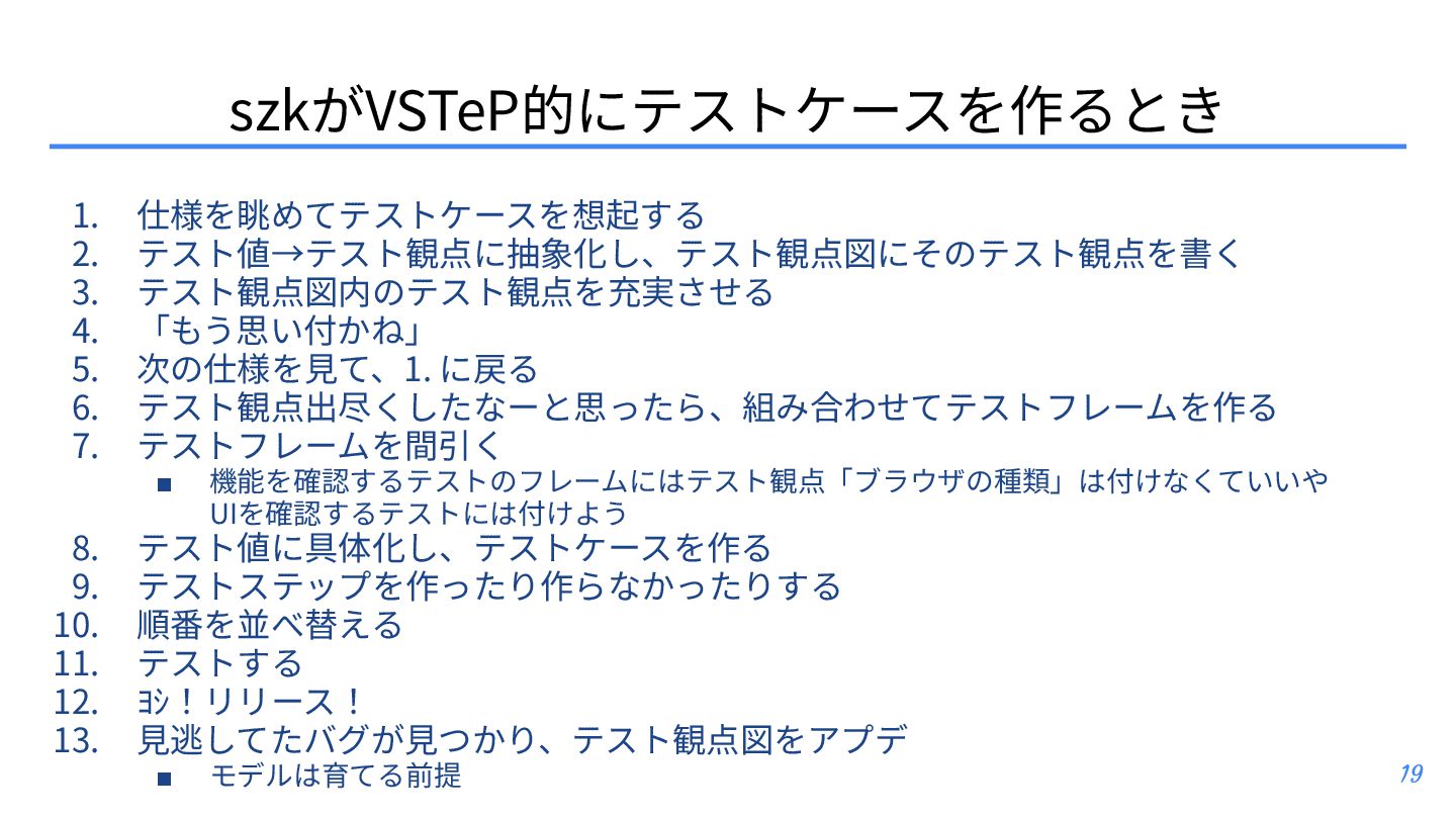 テスト観点 ▪ テスト条件とテスト観点: https://posfie.com/@nemorine/p/Ka0oH8i ▪ 「テスト観点はふんわりね」: https://qualab.jp/fundamentals_of_viewpoint/ ▪ 「テスト観点が...」って⾔われたときはどうするか?: https://note.com/yumotsuyo/n/n0d661da5b906 • テスト開発 ▪ 第三世代に突⼊したソフトウェアテスト: https://www.jasst.jp/archives/jasst10t/pdf/s1.pdf ▪ テスト設計チュートリアル テスコン編 ’25: https://youtu.be/QjASgnMCSas?si=8FgFeVt5CFptOaDA • その他関連トピック ▪ モデリングのそだてかた: https://speakerdeck.com/mizunori/how-to-learn-modeling ▪ 空間構築または空間探索として、ソフトウェアテスティング‧プロダクト開発‧創作活動を捉 えてみる: https://hansuoi.hatenablog.com/entry/2025/05/15/080020 21