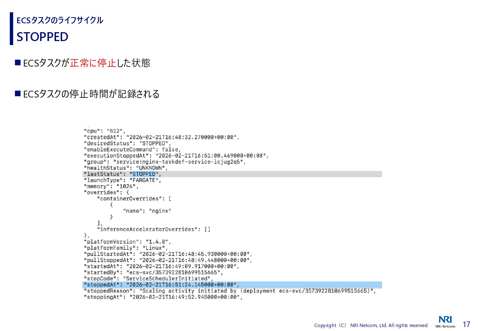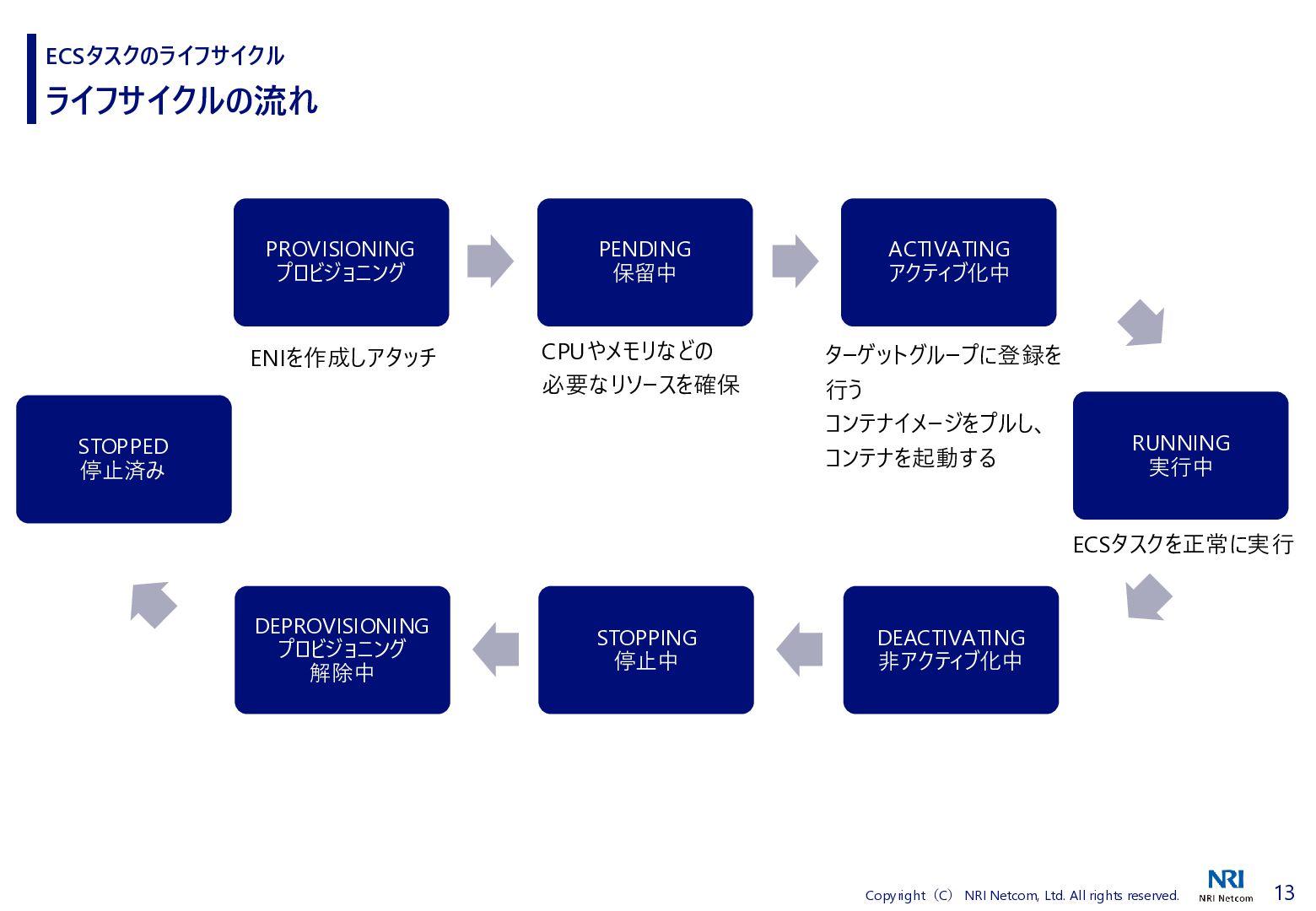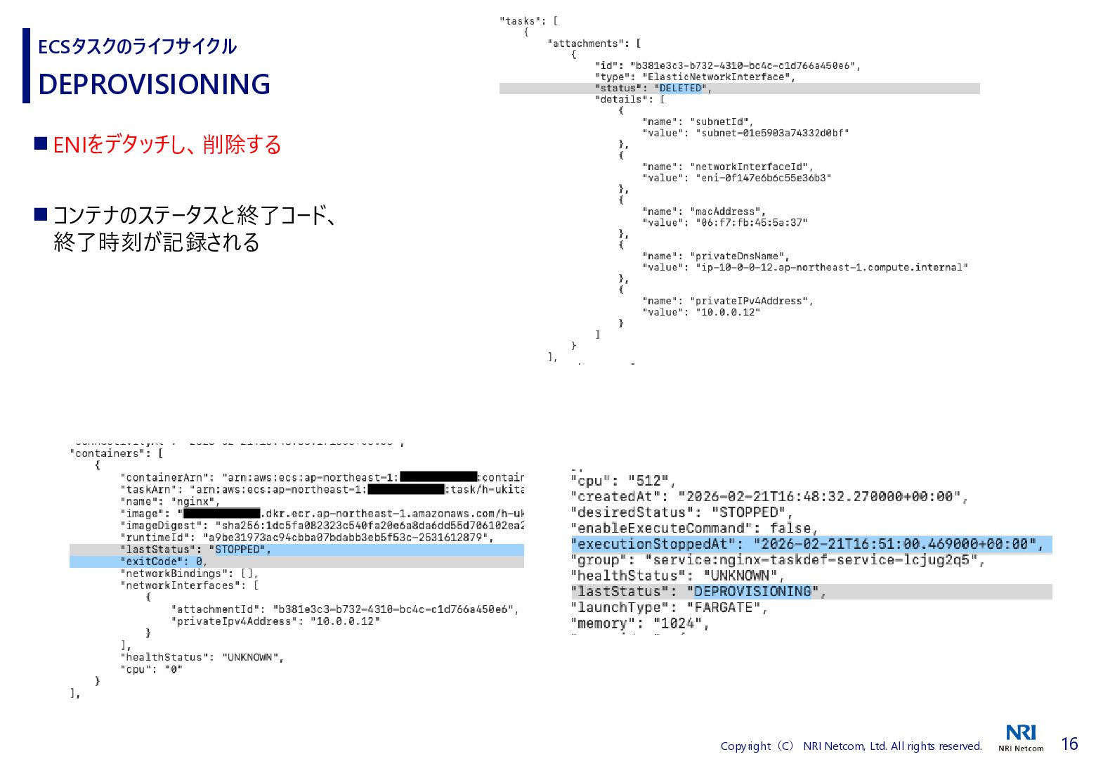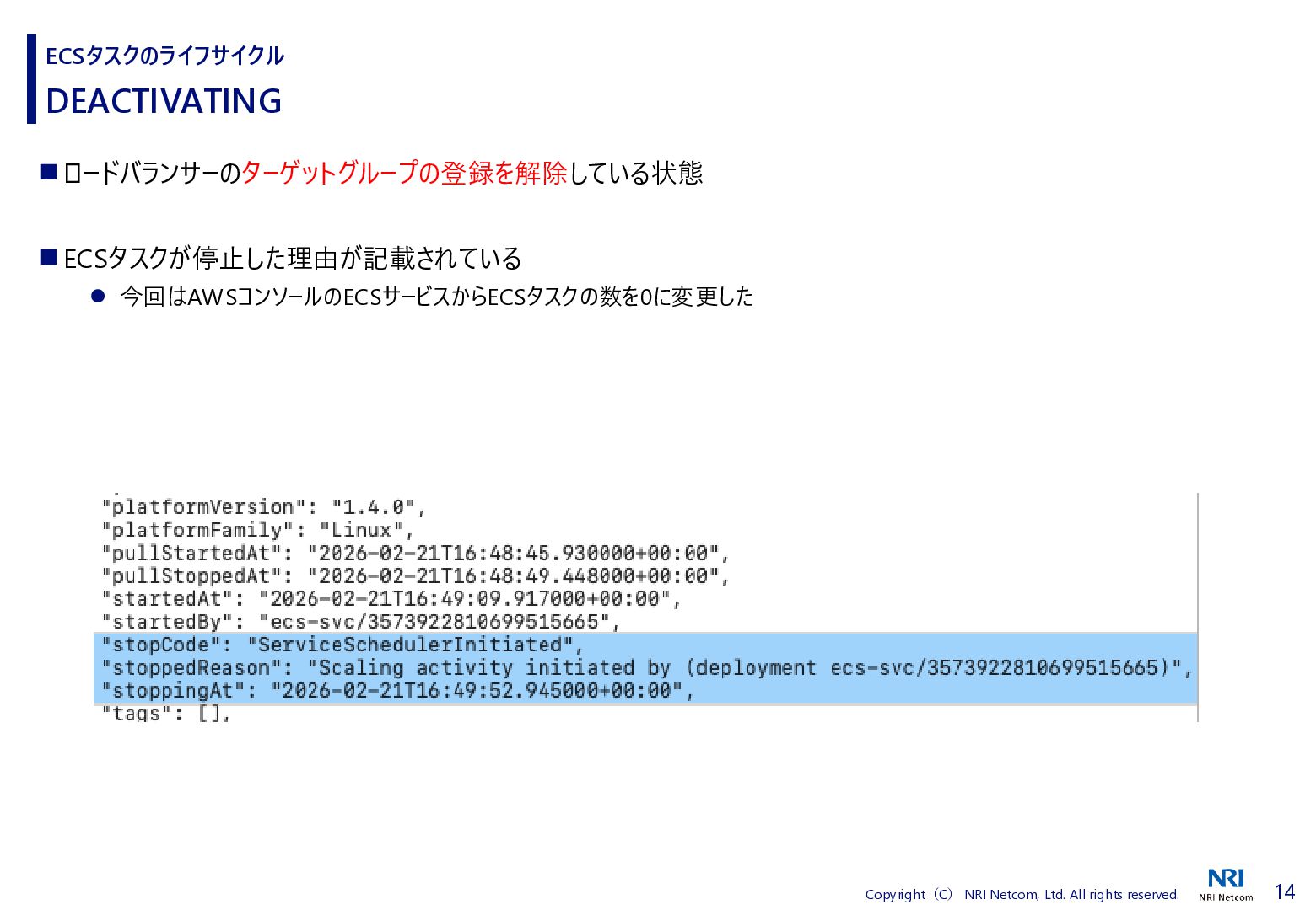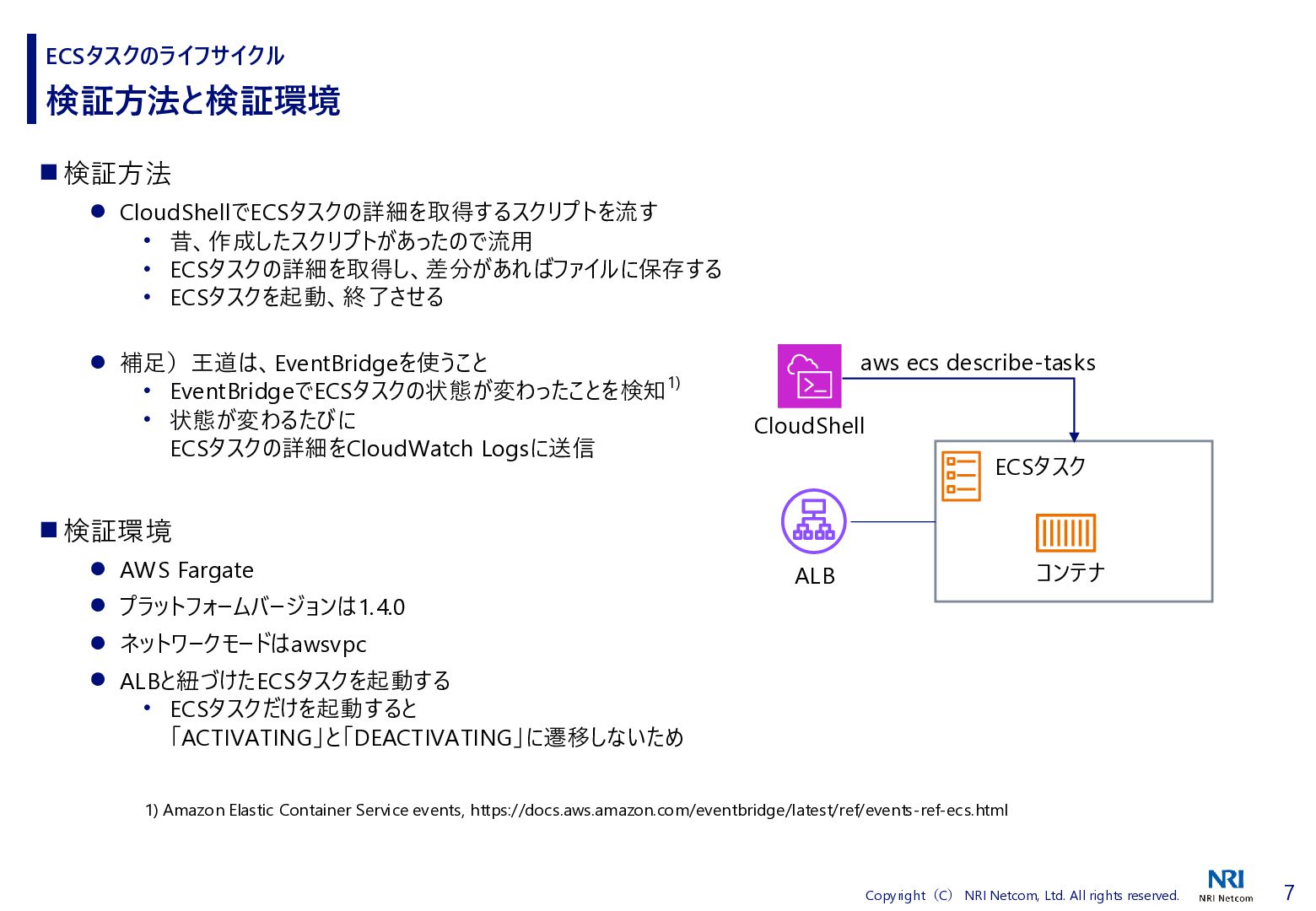 検証方法 ⚫ CloudShellでECSタスクの詳細を取得するスクリプトを流す • 昔、作成したスクリプトがあったので流用 • ECSタスクの詳細を取得し、差分があればファイルに保存する • ECSタスクを起動、終了させる ⚫ 補足)王道は、EventBridgeを使うこと • EventBridgeでECSタスクの状態が変わったことを検知1) • 状態が変わるたびに ECSタスクの詳細をCloudWatch Logsに送信 ◼ 検証環境 ⚫ AWS Fargate ⚫ プラットフォームバージョンは1.4.0 ⚫ ネットワークモードはawsvpc ⚫ ALBと紐づけたECSタスクを起動する • ECSタスクだけを起動すると 「ACTIVATING」と「DEACTIVATING」に遷移しないため ECSタスクのライフサイクル 1) Amazon Elastic Container Service events, https://docs.aws.amazon.com/eventbridge/latest/ref/events-ref-ecs.html コンテナ ECSタスク ALB CloudShell aws ecs describe-tasks