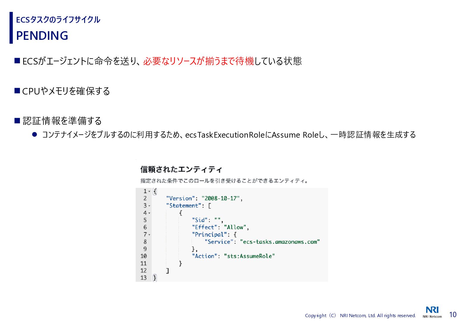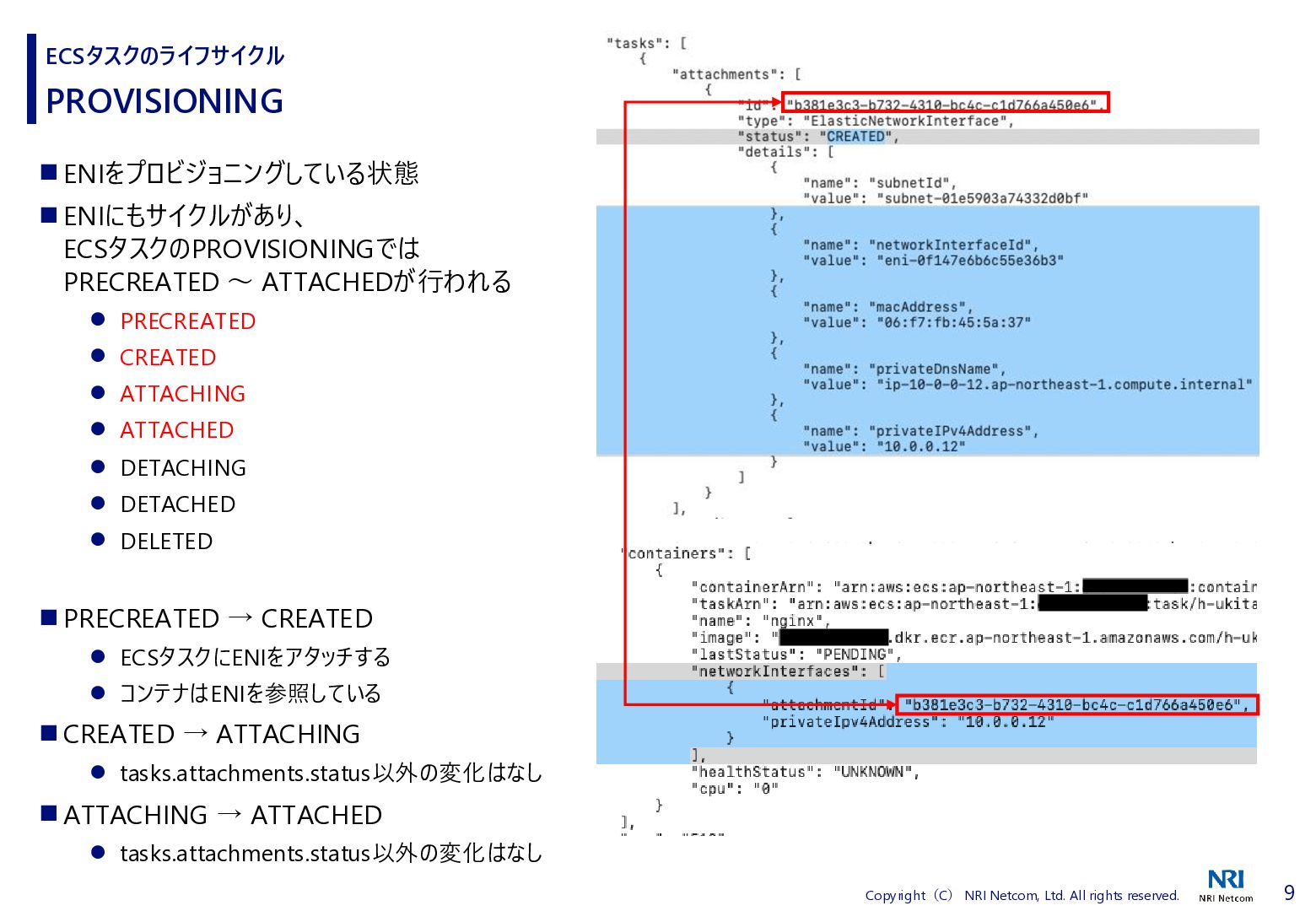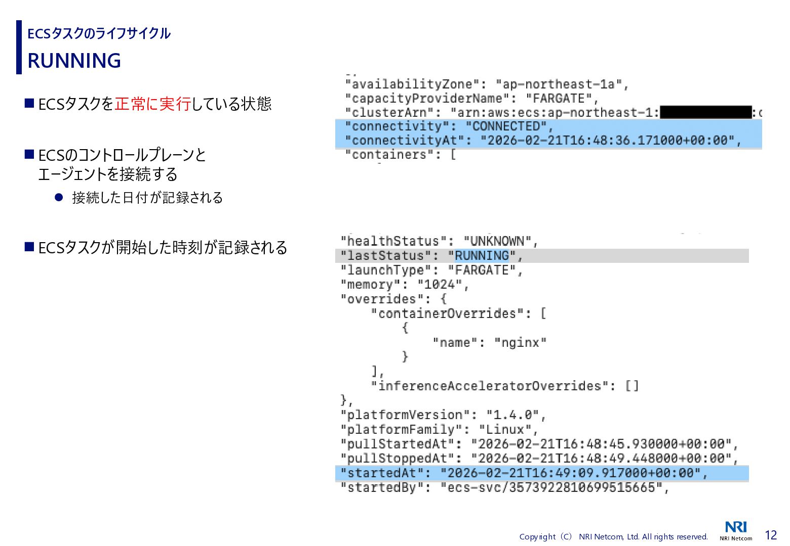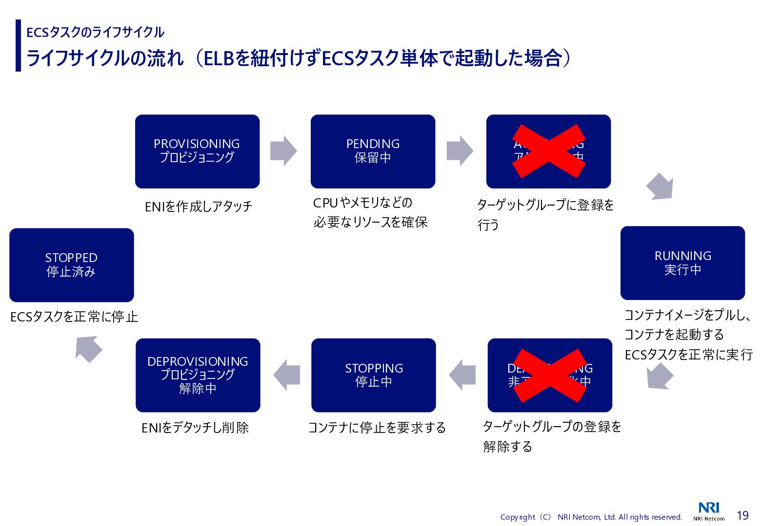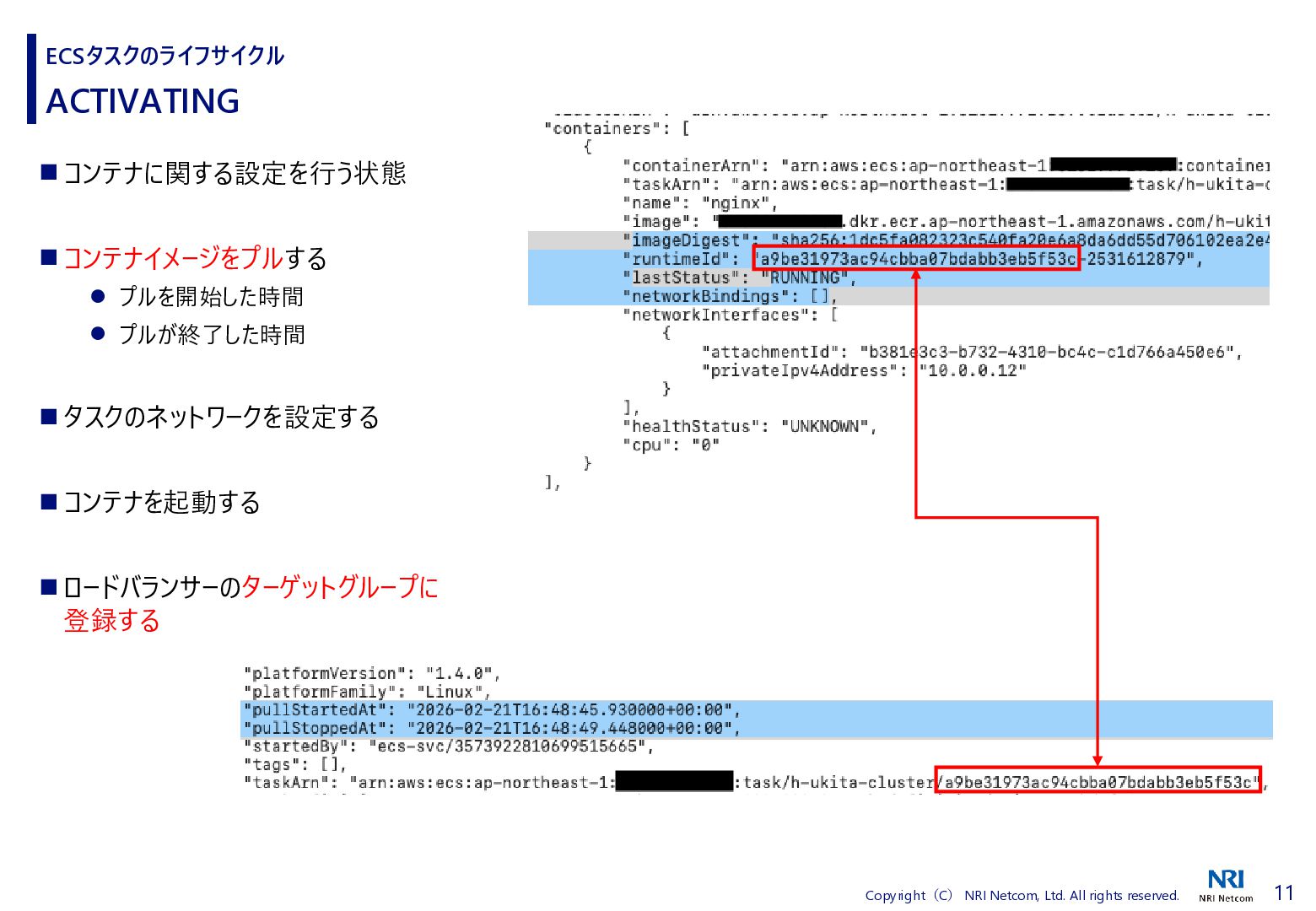 検証方法 ⚫ CloudShellでECSタスクの詳細を取得するスクリプトを流す • 昔、作成したスクリプトがあったので流用 • ECSタスクの詳細を取得し、差分があればファイルに保存する • ECSタスクを起動、終了させる ⚫ 補足)王道は、EventBridgeを使うこと • EventBridgeでECSタスクの状態が変わったことを検知1) • 状態が変わるたびに ECSタスクの詳細をCloudWatch Logsに送信 ◼ 検証環境 ⚫ AWS Fargate ⚫ プラットフォームバージョンは1.4.0 ⚫ ネットワークモードはawsvpc ⚫ ALBと紐づけたECSタスクを起動する • ECSタスクだけを起動すると 「ACTIVATING」と「DEACTIVATING」に遷移しないため ECSタスクのライフサイクル 1) Amazon Elastic Container Service events, https://docs.aws.amazon.com/eventbridge/latest/ref/events-ref-ecs.html コンテナ ECSタスク ALB CloudShell aws ecs describe-tasks