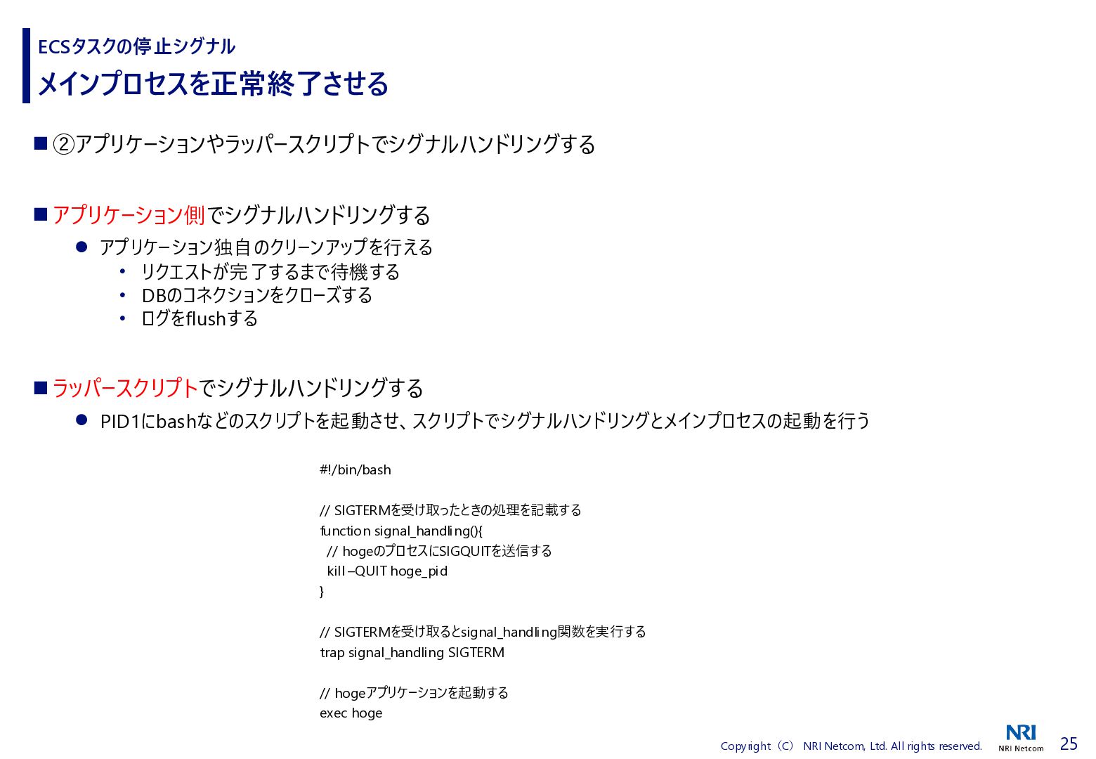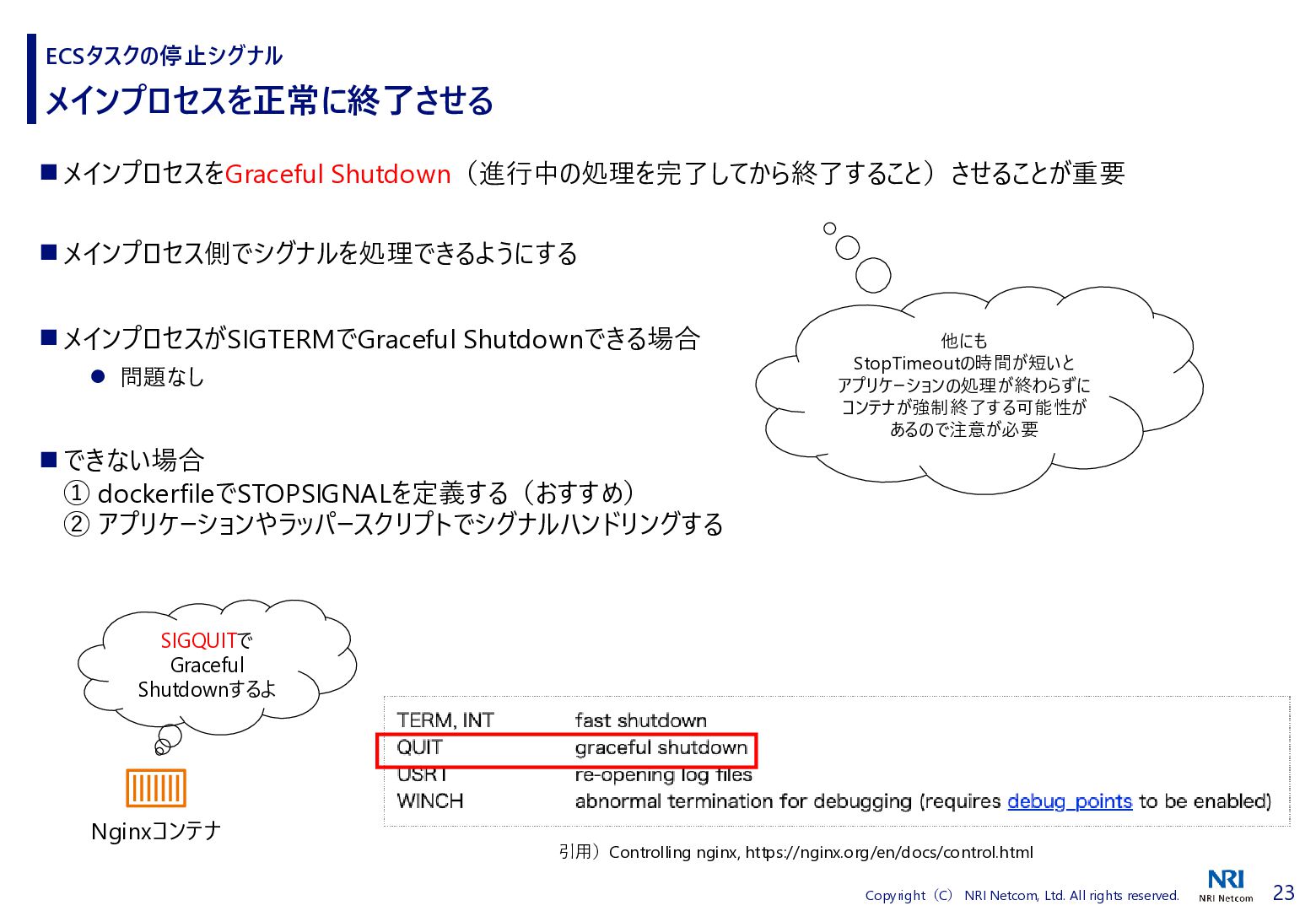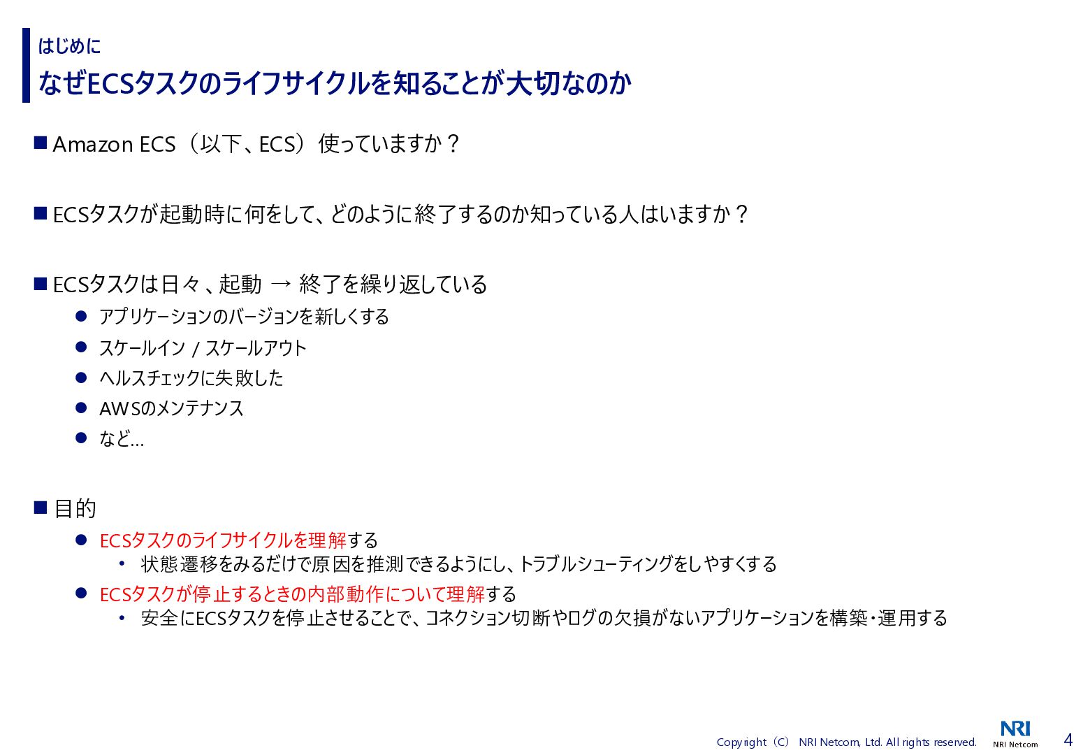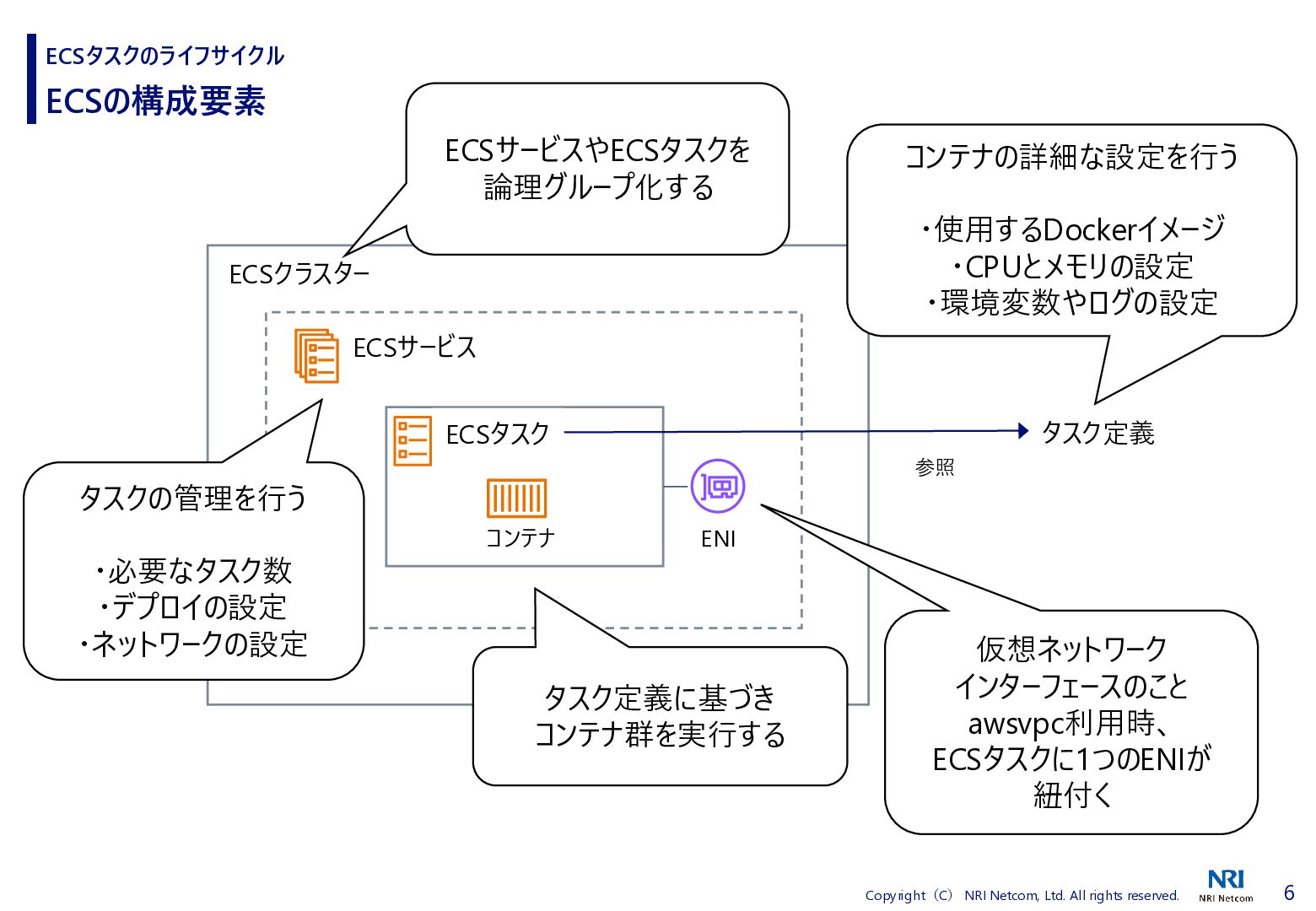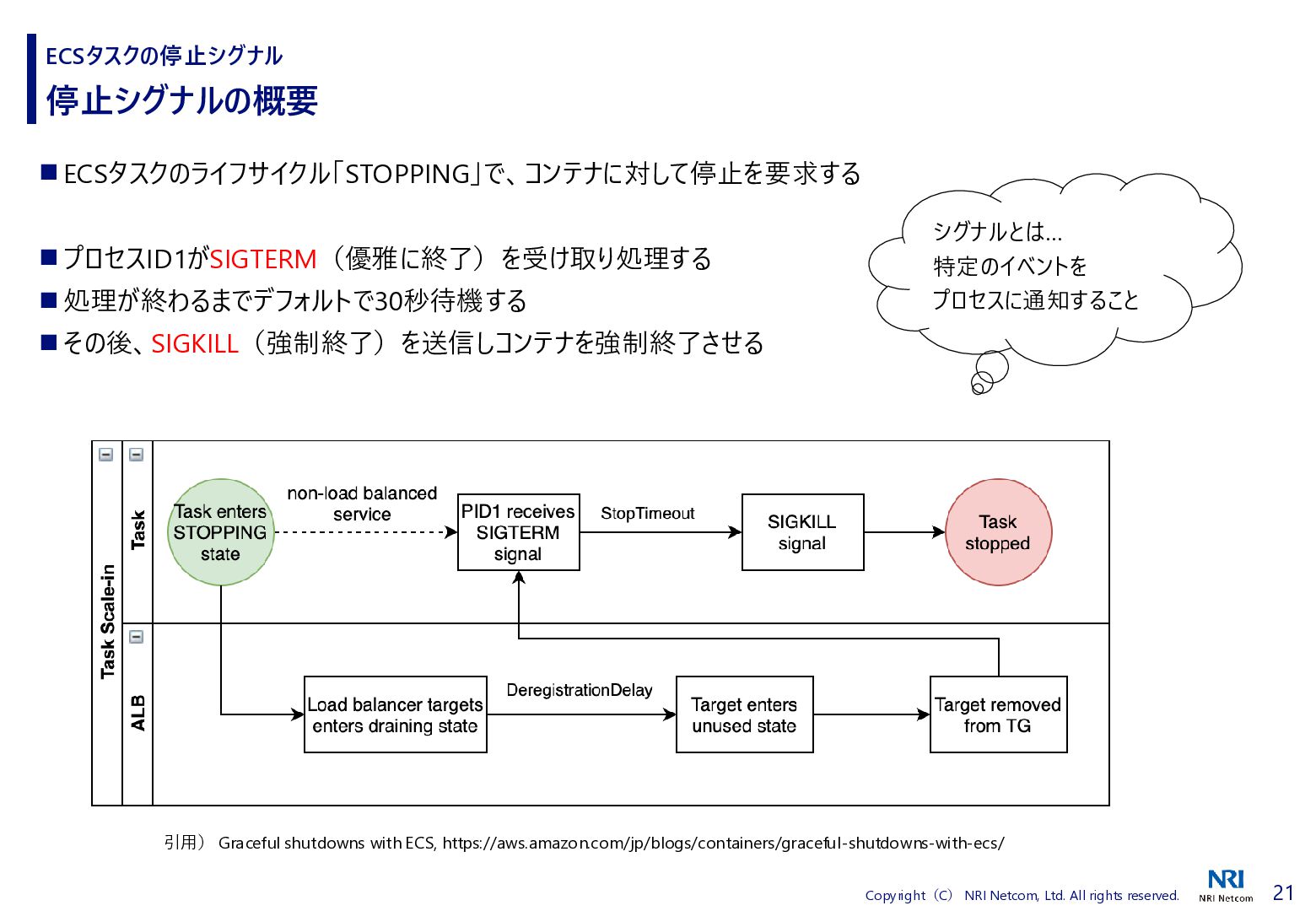 検証方法 ⚫ CloudShellでECSタスクの詳細を取得するスクリプトを流す • 昔、作成したスクリプトがあったので流用 • ECSタスクの詳細を取得し、差分があればファイルに保存する • ECSタスクを起動、終了させる ⚫ 補足)王道は、EventBridgeを使うこと • EventBridgeでECSタスクの状態が変わったことを検知1) • 状態が変わるたびに ECSタスクの詳細をCloudWatch Logsに送信 ◼ 検証環境 ⚫ AWS Fargate ⚫ プラットフォームバージョンは1.4.0 ⚫ ネットワークモードはawsvpc ⚫ ALBと紐づけたECSタスクを起動する • ECSタスクだけを起動すると 「ACTIVATING」と「DEACTIVATING」に遷移しないため ECSタスクのライフサイクル 1) Amazon Elastic Container Service events, https://docs.aws.amazon.com/eventbridge/latest/ref/events-ref-ecs.html コンテナ ECSタスク ALB CloudShell aws ecs describe-tasks