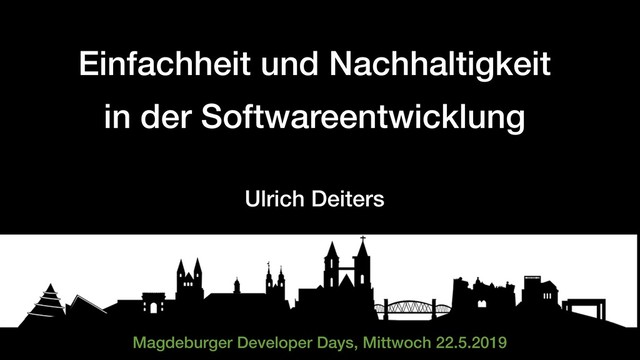 Nachhaltigkeit“ auf den „Magdeburger Developer Days 2019“ am 21.5.2019 • Die Folien sind nicht selbsterklärend sondern dienen der Unterstützung des Vortrags • Ich freue mich über Fragen und Feedback Einfachheit und Nachhaltigkeit in der Softwareentwicklung von Ulrich Deiters ist lizenziert unter einer Creative Commons Namensnennung - Weitergabe unter gleichen Bedingungen 4.0 International Lizenz.