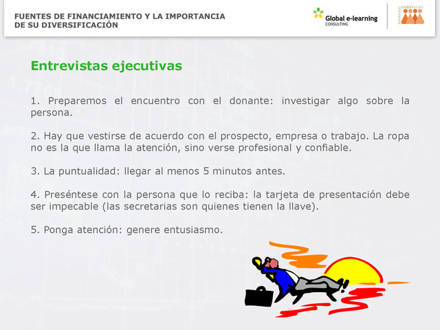 un gusto escuchar nuestro nombre. 12. Mencione el tiempo de la cita y cúmplalo. 13. La actitud siempre de ganador, como si ya logramos el donativo. 14. Escuche más de lo que hable, es mejor ser escuchado. Escuchando encontraremos puntos importantes. 15. Iniciada la reunión, acepte algo de tomar, si alguien lo acompaña no pida nada complicado, para no perder el tiempo. 16. Al escuchar debe sonreír o mover la cabeza.