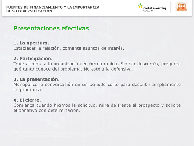 de interés. 2. Participación. Traer al tema a la organización en forma rápida. Sin ser descortés, pregunte qué tanto conoce del problema. No esté a la defensiva. 3. La presentación. Monopolice la conversación en un periodo corto para describir ampliamente su programa. 4. El cierre. Comienza cuando hicimos la solicitud, mire de frente al prospecto y solicite el donativo con determinación.