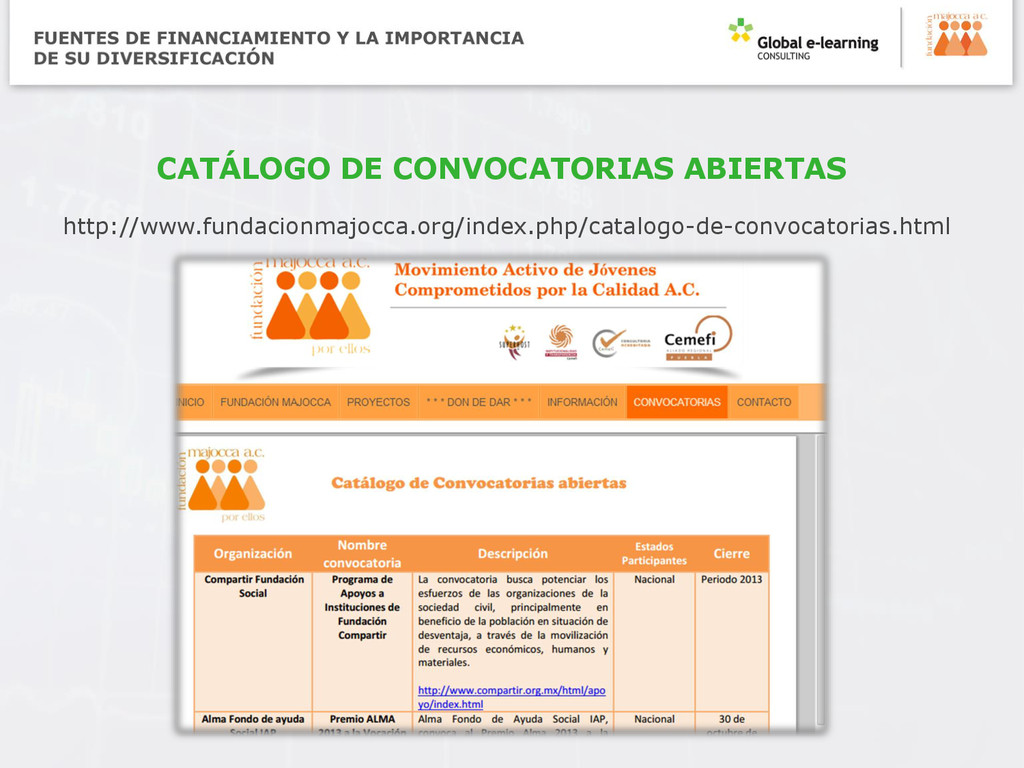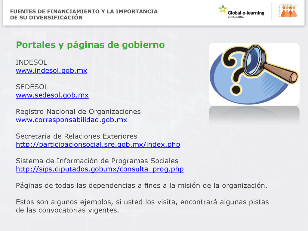 Nacional de Organizaciones www.corresponsabilidad.gob.mx Secretaría de Relaciones Exteriores http://participacionsocial.sre.gob.mx/index.php Sistema de Información de Programas Sociales http://sips.diputados.gob.mx/consulta_prog.php Páginas de todas las dependencias a fines a la misión de la organización. Estos son algunos ejemplos, si usted los visita, encontrará algunas pistas de las convocatorias vigentes.