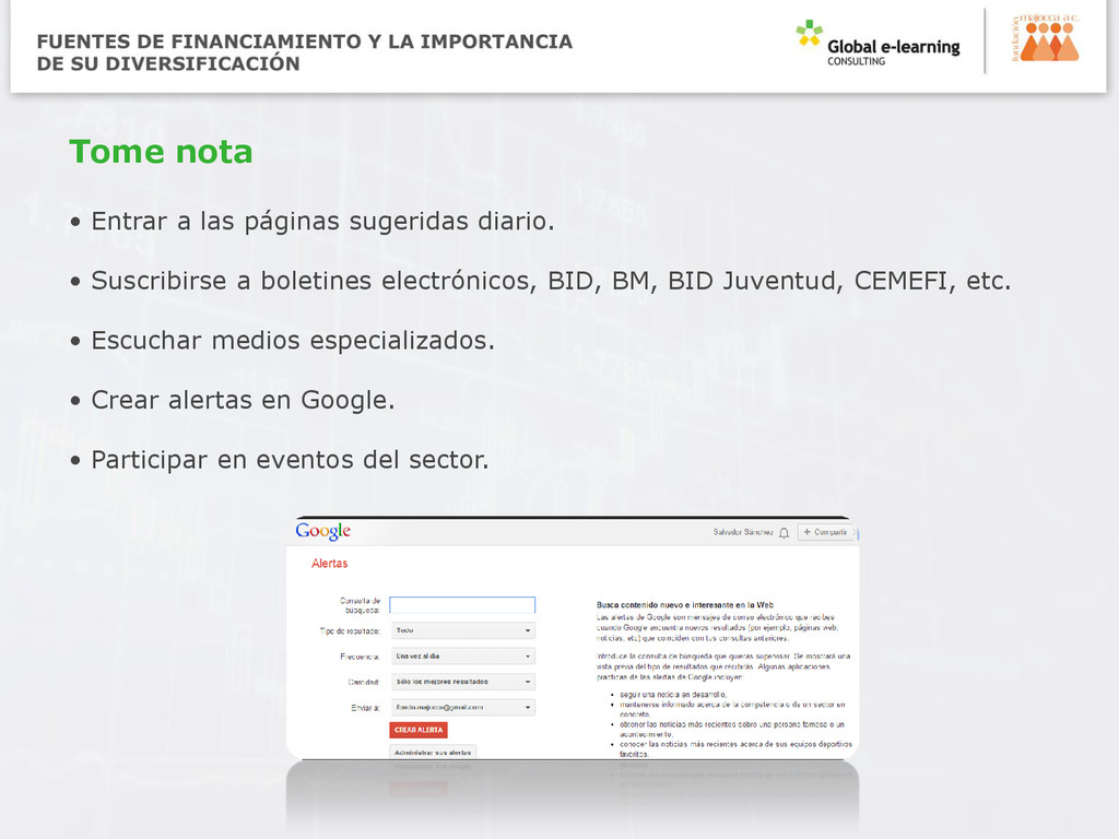 Suscribirse a boletines electrónicos, BID, BM, BID Juventud, CEMEFI, etc. • Escuchar medios especializados. • Crear alertas en Google. • Participar en eventos del sector.