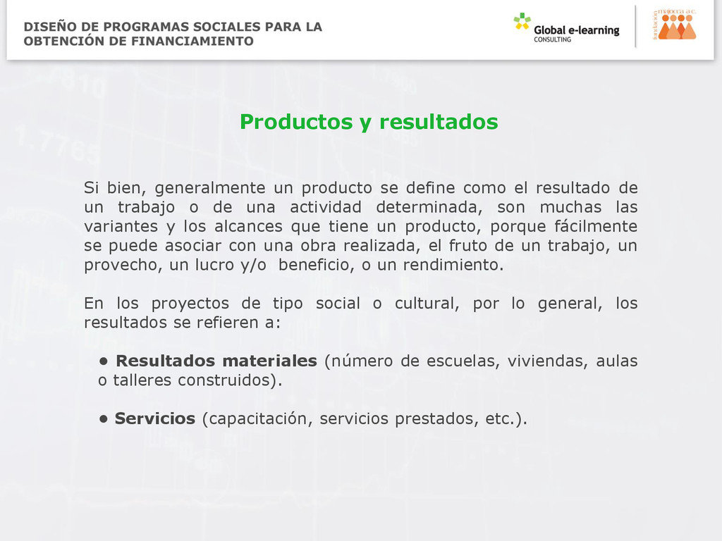 como el resultado de un trabajo o de una actividad determinada, son muchas las variantes y los alcances que tiene un producto, porque fácilmente se puede asociar con una obra realizada, el fruto de un trabajo, un provecho, un lucro y/o beneficio, o un rendimiento. En los proyectos de tipo social o cultural, por lo general, los resultados se refieren a: • Resultados materiales (número de escuelas, viviendas, aulas o talleres construidos). • Servicios (capacitación, servicios prestados, etc.).