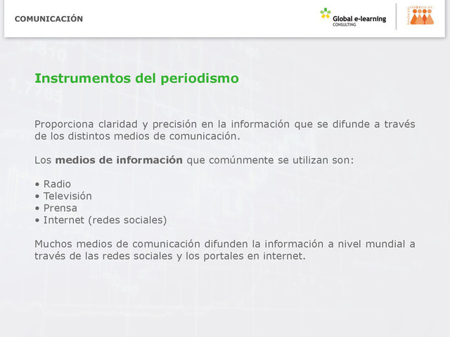 que se difunde a través de los distintos medios de comunicación. Los medios de información que comúnmente se utilizan son: • Radio • Televisión • Prensa • Internet (redes sociales) Muchos medios de comunicación difunden la información a nivel mundial a través de las redes sociales y los portales en internet.
