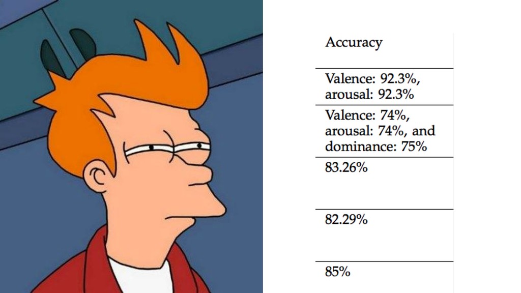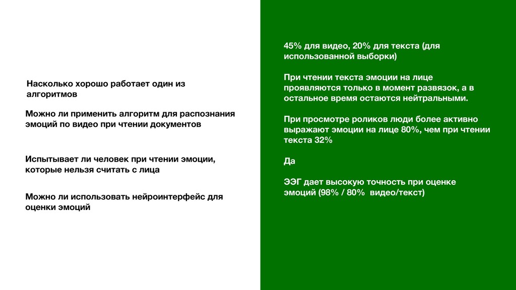 чтении документов Испытывает ли человек при чтении эмоции, которые нельзя считать с лица Можно ли использовать нейроинтерфейс для оценки эмоций Насколько хорошо работает один из алгоритмов 45% для видео, 20% для текста (для использованной выборки) При чтении текста эмоции на лице проявляются только в момент развязок, а в остальное время остаются нейтральными. При просмотре роликов люди более активно выражают эмоции на лице 80%, чем при чтении текста 32% Да ЭЭГ дает высокую точность при оценке эмоций (98% / 80% видео/текст)