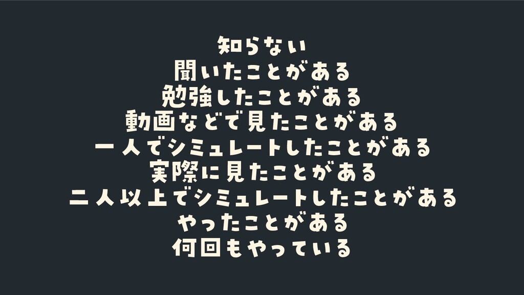 知らない 聞いたことがある 勉強したことがある 動画などで見たことがある 一人でシミュレートしたことがある 実際に見たことがある 二人以上でシミュレートしたことがある やったことがある 何回もやっている