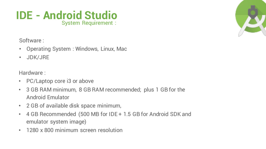 Operating System : Windows, Linux, Mac • JDK/JRE Hardware : • PC/Laptop core i3 or above • 3 GB RAM minimum, 8 GB RAM recommended; plus 1 GB for the Android Emulator • 2 GB of available disk space minimum, • 4 GB Recommended (500 MB for IDE + 1.5 GB for Android SDK and emulator system image) • 1280 x 800 minimum screen resolution
