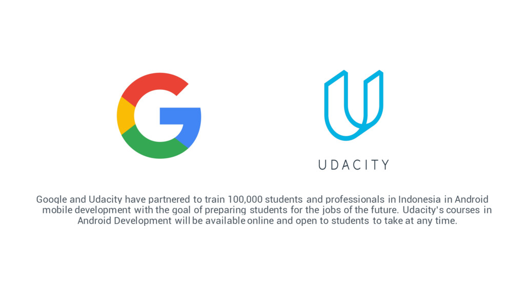 professionals in Indonesia in Android mobile development with the goal of preparing students for the jobs of the future. Udacity’s courses in Android Development will be available online and open to students to take at any time.