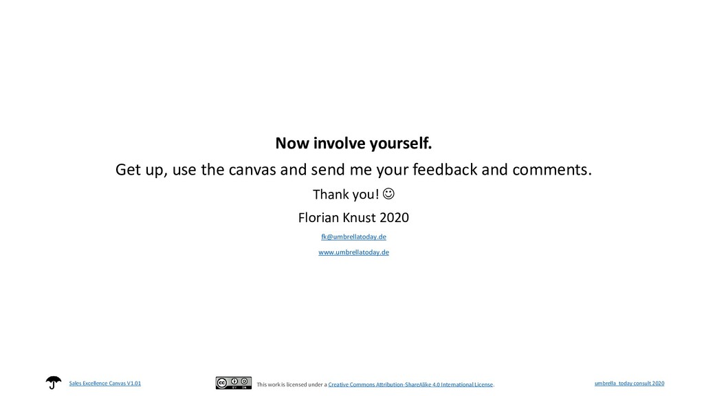 me your feedback and comments. Thank you! ☺ Florian Knust 2020 [email protected] www.umbrellatoday.de umbrella today consult 2020 Sales Excellence Canvas V1.01 This work is licensed under a Creative Commons Attribution-ShareAlike 4.0 International License.
