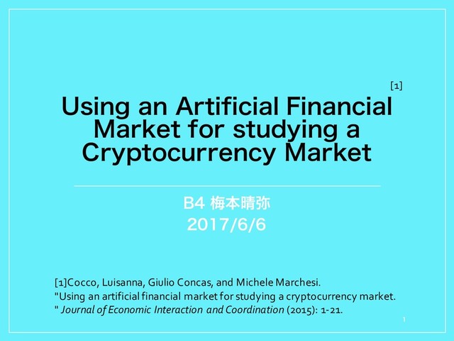 [10]Cocco, Luisanna, Giulio Concas, and Michele Marchesi. "Using an artificial financial market for studying a cryptocurrency market. " Journal of Economic Interaction and Coordination (2015): 1-21. [10]