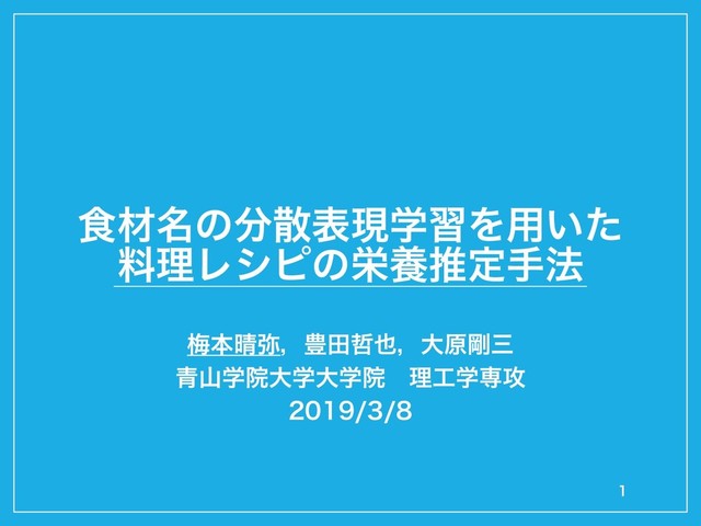 【WSSIT2019】食材名の分散表現学習を用いた料理レシピの栄養推定手法