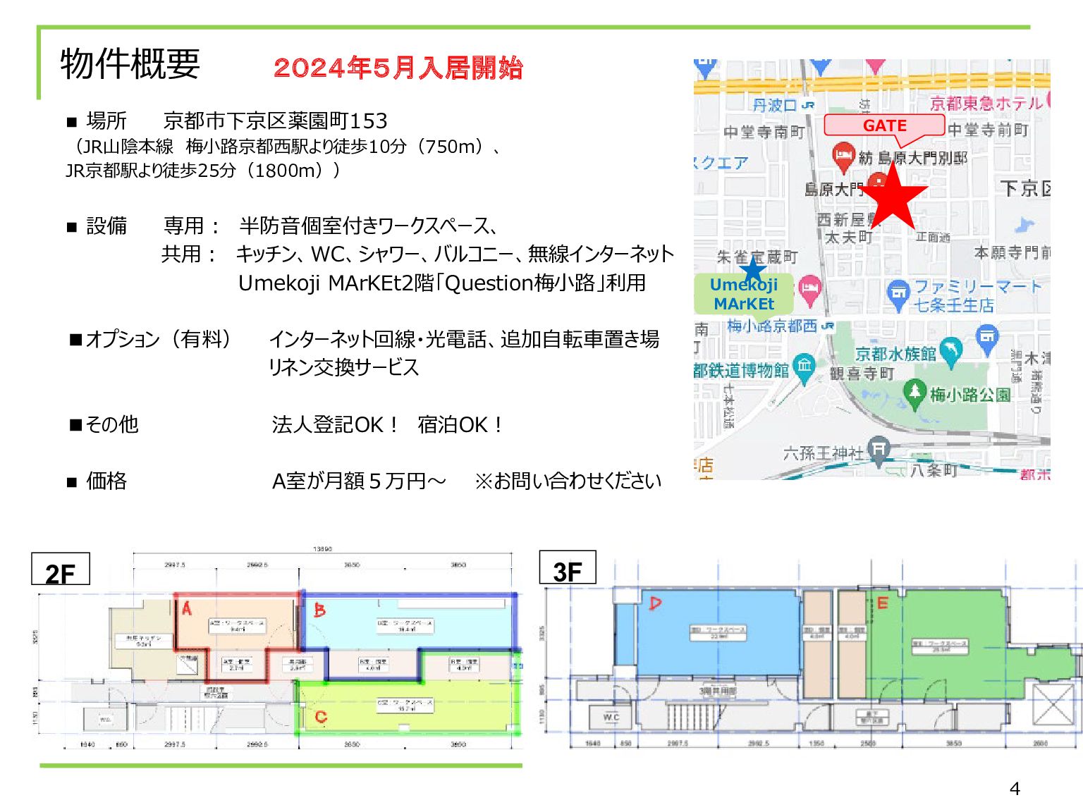 半防音個室付きワークスペース、 共用: キッチン、WC、シャワー、バルコニー、無線インターネット Umekoji MArKEt2階「Question梅小路」利用 ▪オプション(有料) インターネット回線・光電話、追加自転車置き場 リネン交換サービス ▪その他 法人登記OK! 宿泊OK! 価格 A室が月額5万円~ ※お問い合わせください 物件概要 2024年5月入居開始 3F 2F Umekoji MArKEt GATE