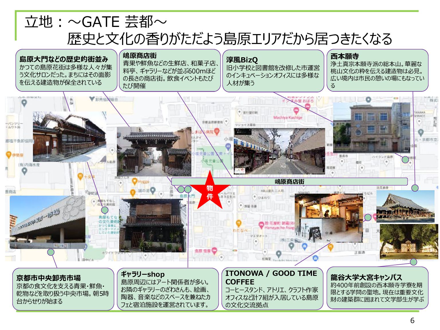 限とする学問の聖地。現在は重要文化 財の建築群に囲まれて文学部生が学ぶ 京都市中央卸売市場 京都の食文化を支える青果・鮮魚・ 乾物などを取り扱う中央市場。朝5時 台からせりが始まる ギャラリーshop 島原周辺にはアート関係者が多い。 お隣のギャラリーのざわさんも、絵画、 陶器、音楽などのスペースを兼ねたカ フェと宿泊施設を運営されています。 島原大門などの歴史的街並み かつての島原花街は多様な人々が集 う文化サロンだった。まちにはその面影 を伝える建造物が保全されている 嶋原商店街 青果や鮮魚などの生鮮店、和菓子店、 料亭、ギャラリーなどが並ぶ600mほど の長さの商店街。飲食イベントもたび たび開催 ITONOWA / GOOD TIME COFFEE コーヒースタンド、アトリエ、クラフト作家 オフィスなど計7組が入居している島原 の文化交流拠点 西本願寺 浄土真宗本願寺派の総本山。華麗な 桃山文化の粋を伝える建造物は必見。 広い境内は市民の憩いの場にもなってい る 嶋原商店街 物 件