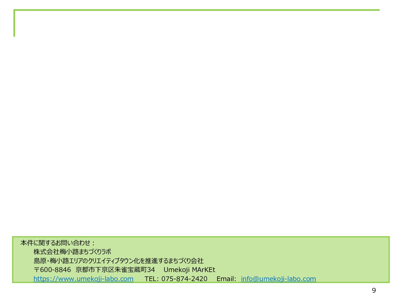 9 本件に関するお問い合わせ: 株式会社梅小路まちづくりラボ 島原・梅小路エリアのクリエイティブタウン化を推進するまちづくり会社 〒600-8846 京都市下京区朱雀宝蔵町34 Umekoji MArKEt https://www.umekoji-labo.com TEL: