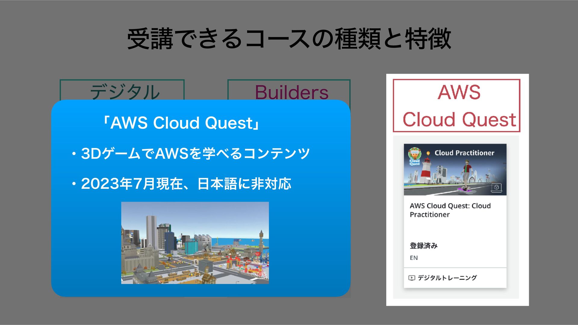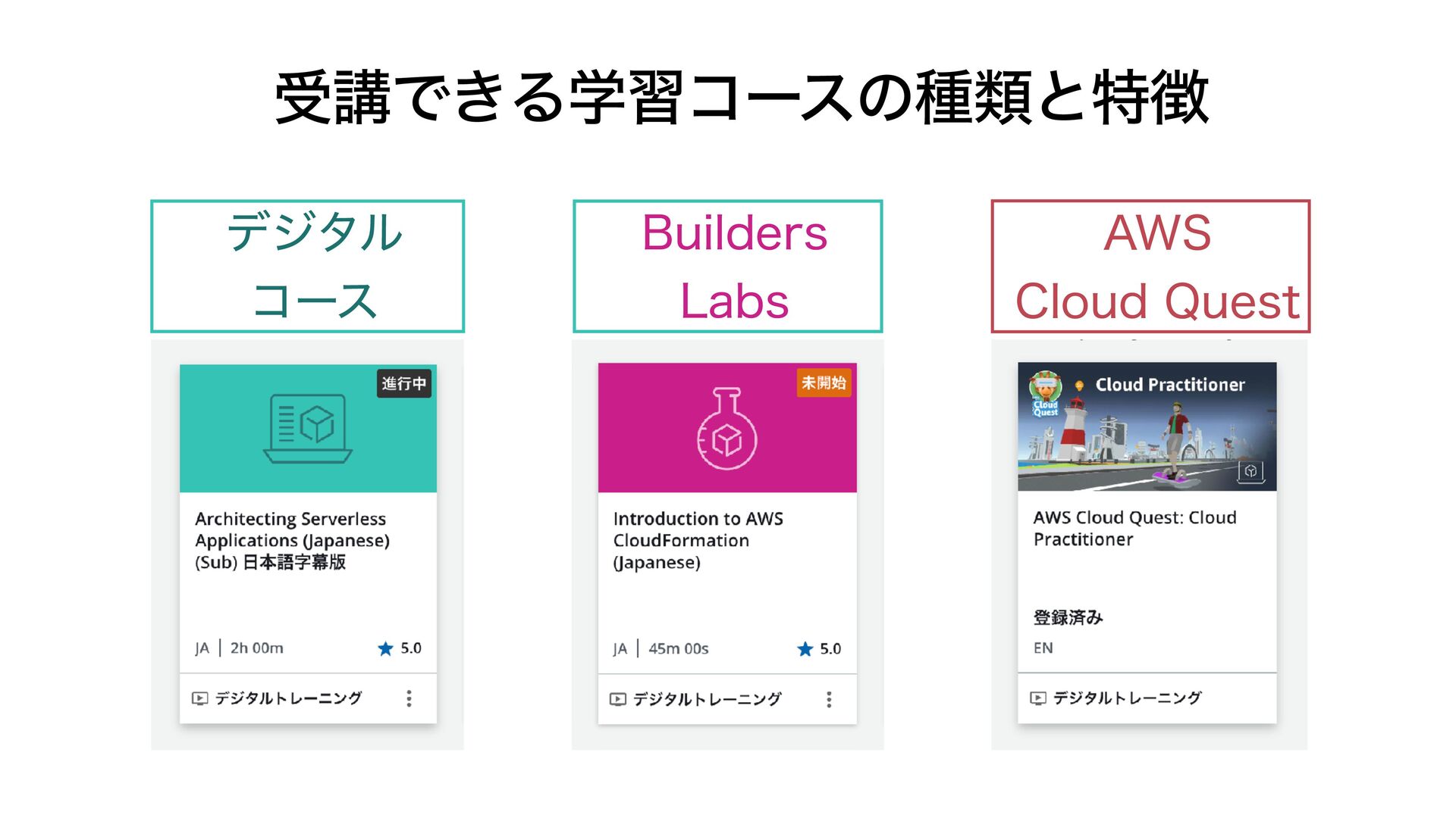 डߨͰ͖Δίʔεͷछྨͱಛ σδλϧ ίʔε #VJMEFST -BCT "84 $MPVE2VFTU ɾ%ήʔϜͰ"84ΛֶΔίϯςϯπ ɾ݄ݱࡏɺຊޠʹඇରԠ ʮ"84$MPVE2VFTUʯ