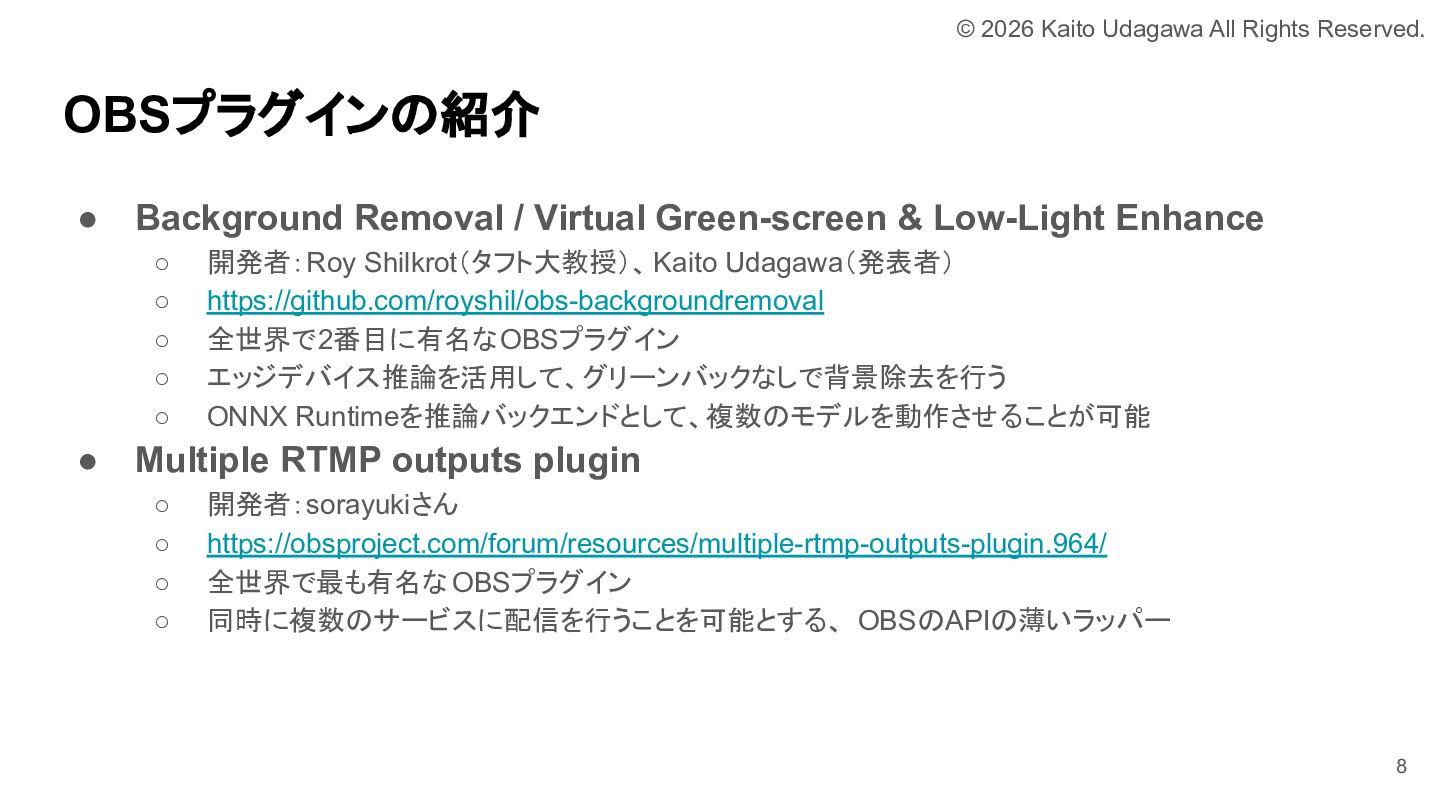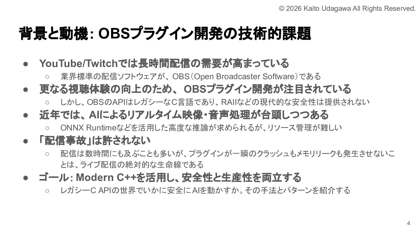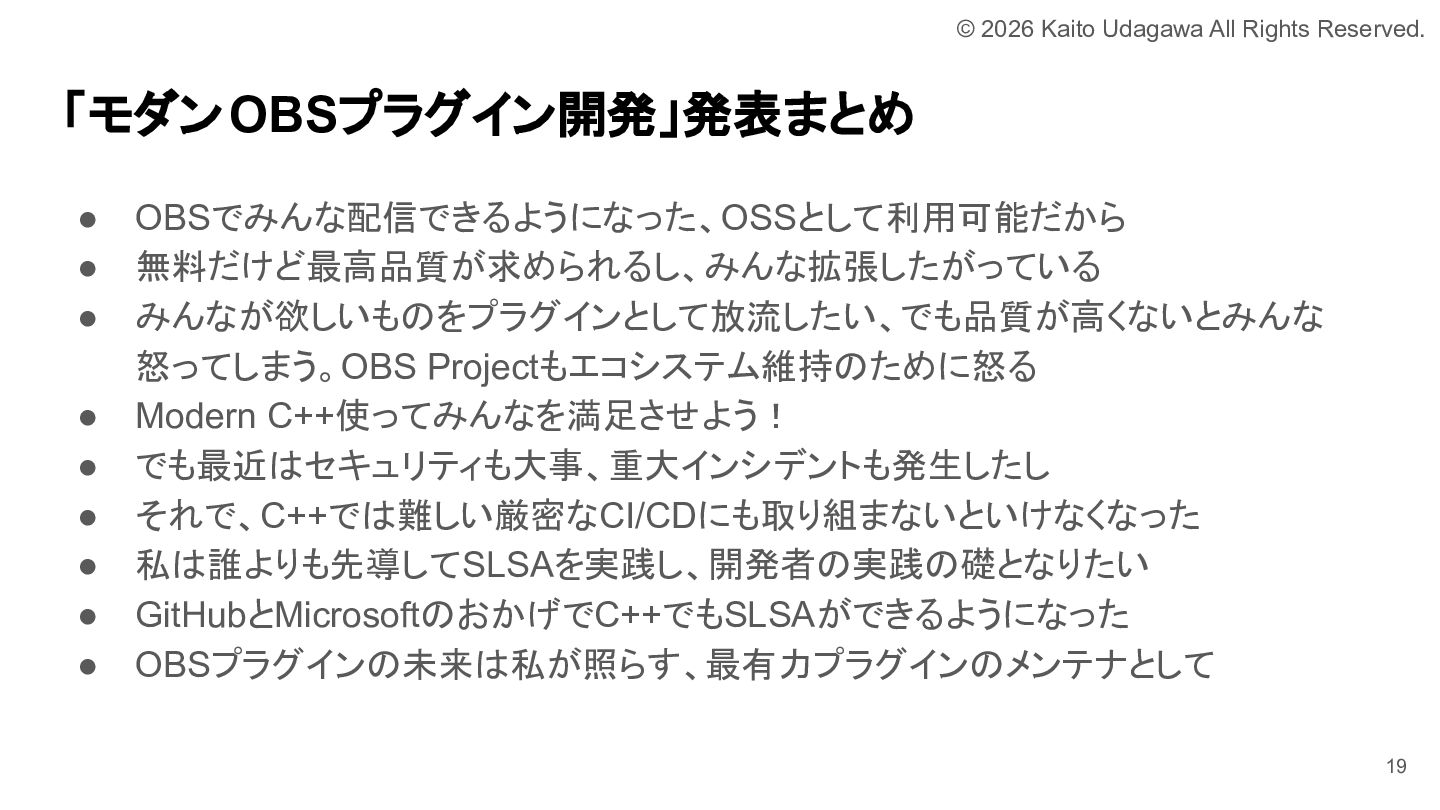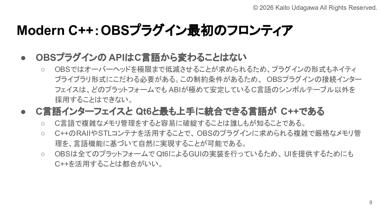C++ MIX 第17回でOBSプラグイン開発について発表しました。 OBSプラグイン開発は厳しい世界ではありますが、誰かがやらなければならない分野でもあります。 我こそはという方は是非挑戦してみてください。 あなたが取り組むために必要な道は、すべて私が舗装しました。 https://lnkd.in/e-NYnsGS