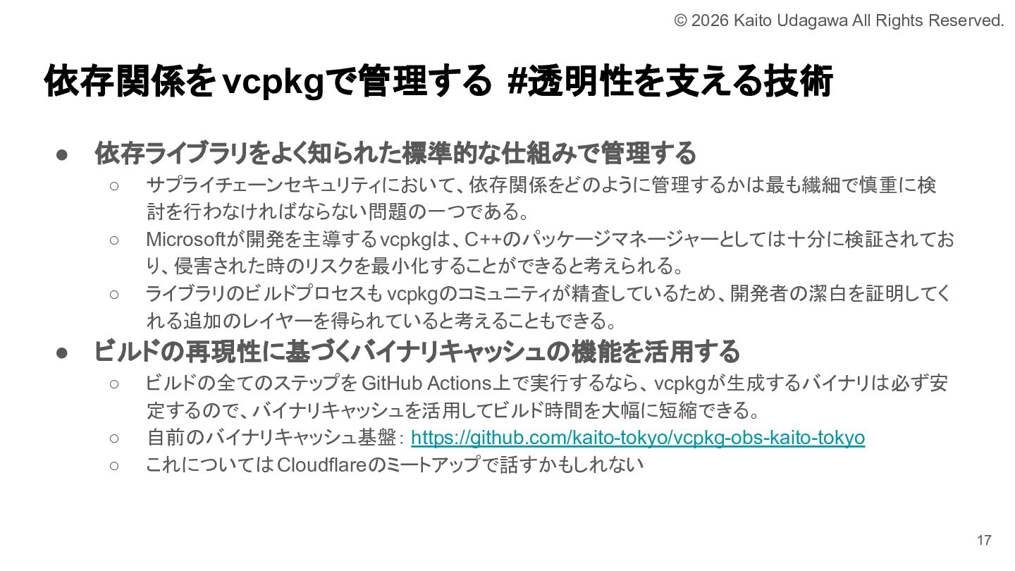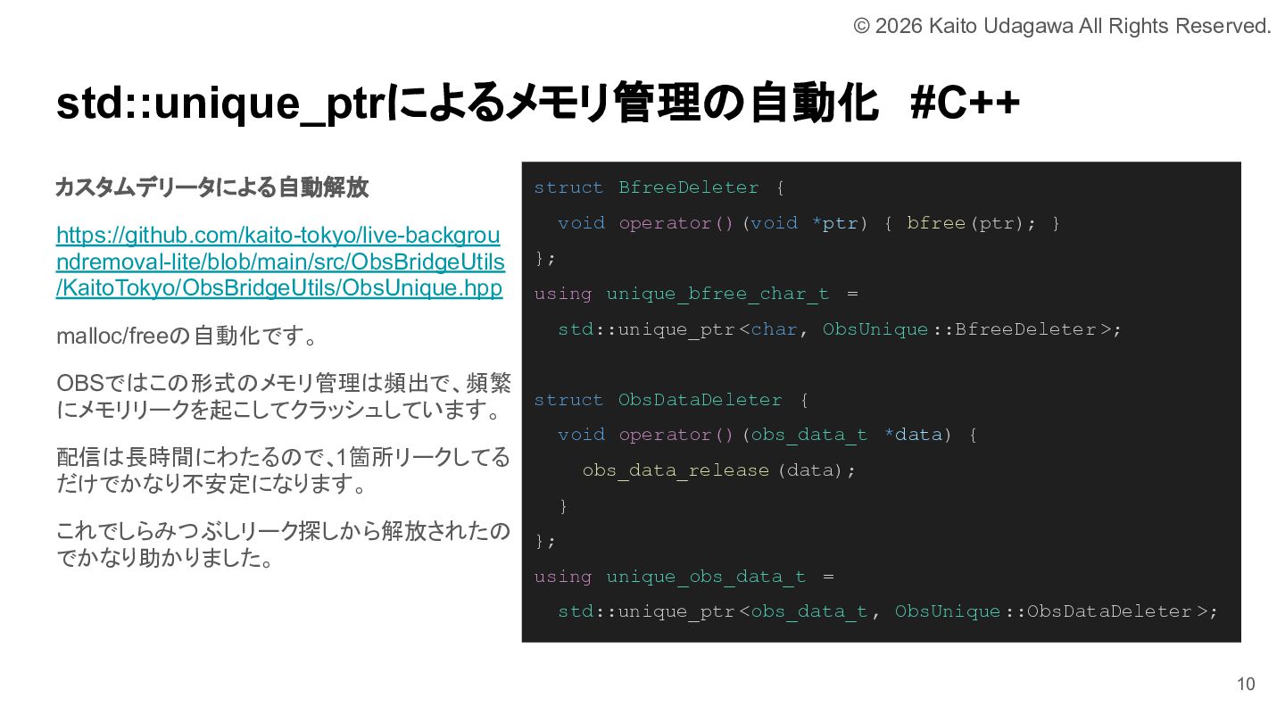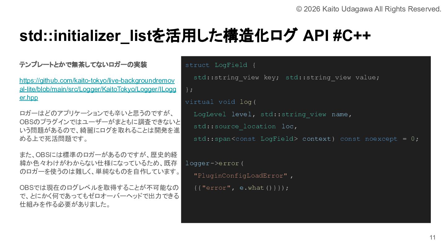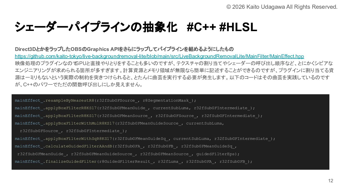 C++ MIX 第17回でOBSプラグイン開発について発表しました。 OBSプラグイン開発は厳しい世界ではありますが、誰かがやらなければならない分野でもあります。 我こそはという方は是非挑戦してみてください。 あなたが取り組むために必要な道は、すべて私が舗装しました。 https://lnkd.in/e-NYnsGS