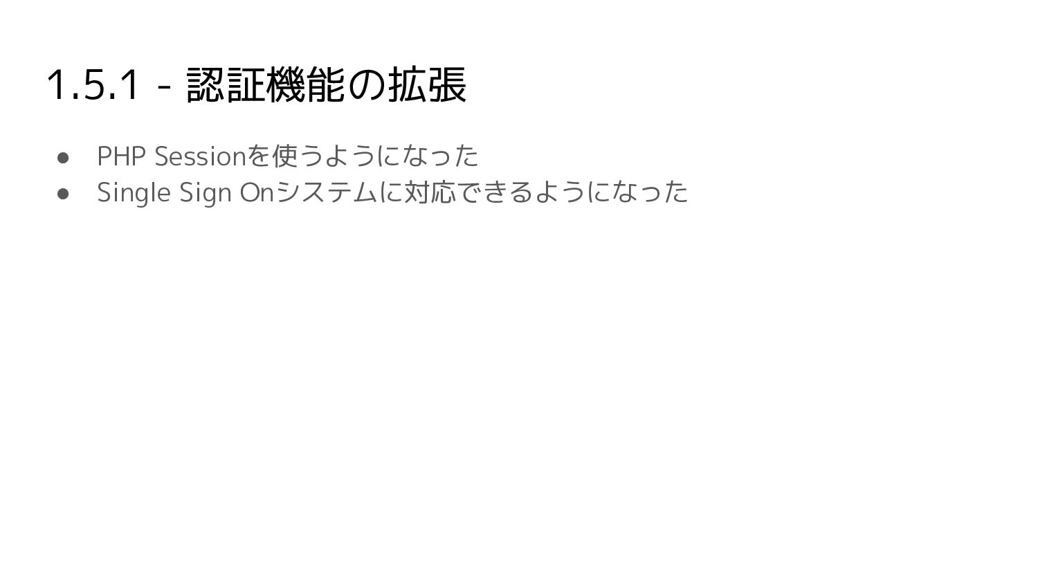 1.5.1 - 認証機能の拡張 • PHP Sessionを使うようになった • Single Sign Onシステムに対応できるようになった