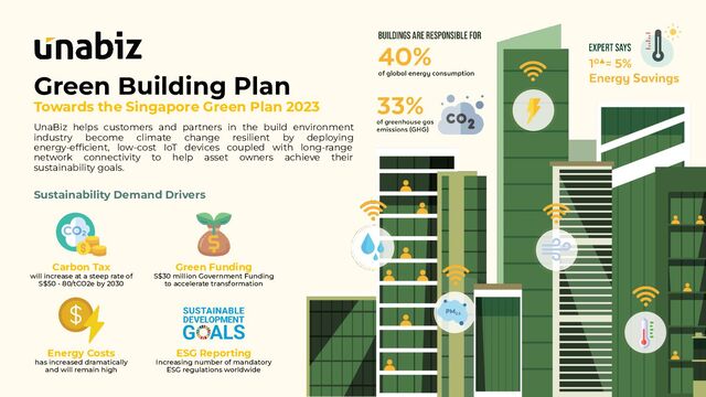 helps customers and partners in the build environment industry become climate change resilient by deploying energy-efficient, low-cost IoT devices coupled with long-range network connectivity to help asset owners achieve their sustainability goals. Sustainability Demand Drivers Carbon Tax will increase at a steep rate of S$50 - 80/tCO2e by 2030 Green Funding S$30 million Government Funding to accelerate transformation Energy Costs has increased dramatically and will remain high ESG Reporting Increasing number of mandatory ESG regulations worldwide