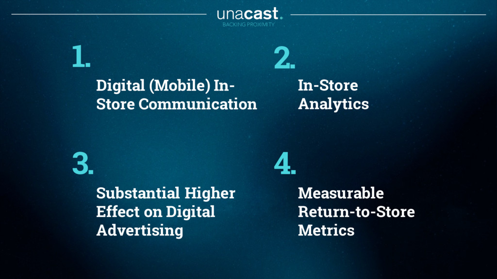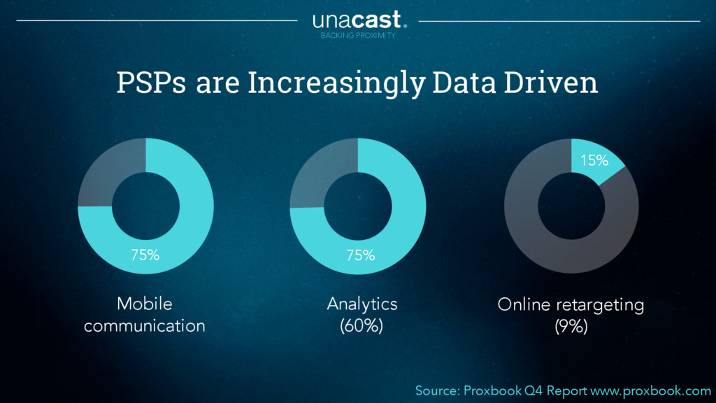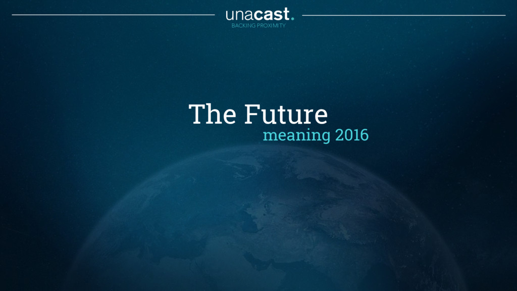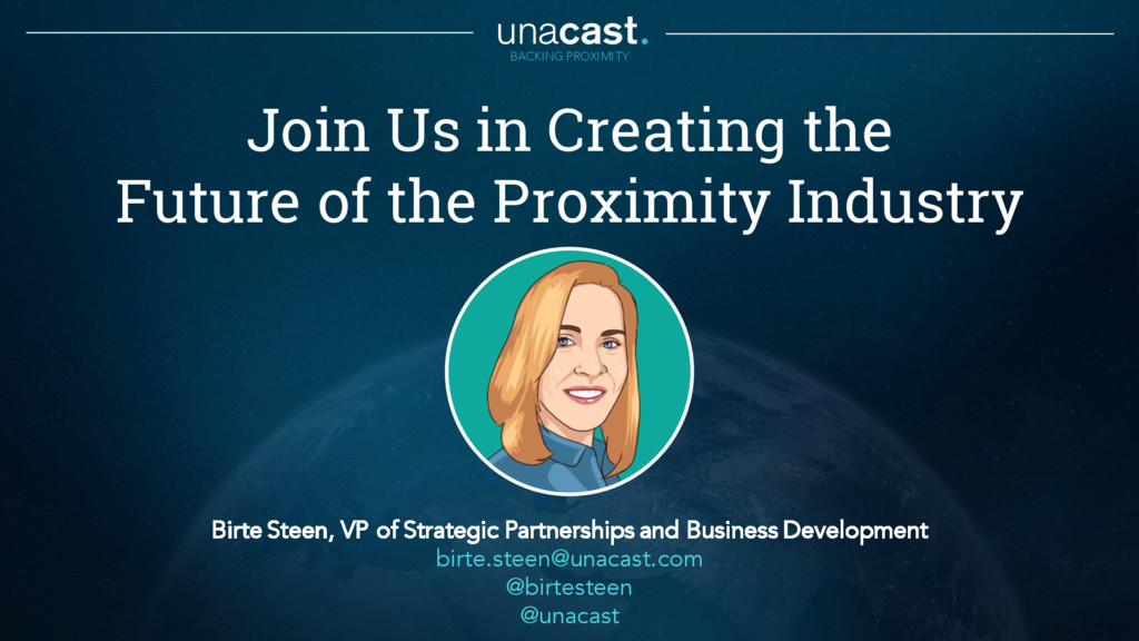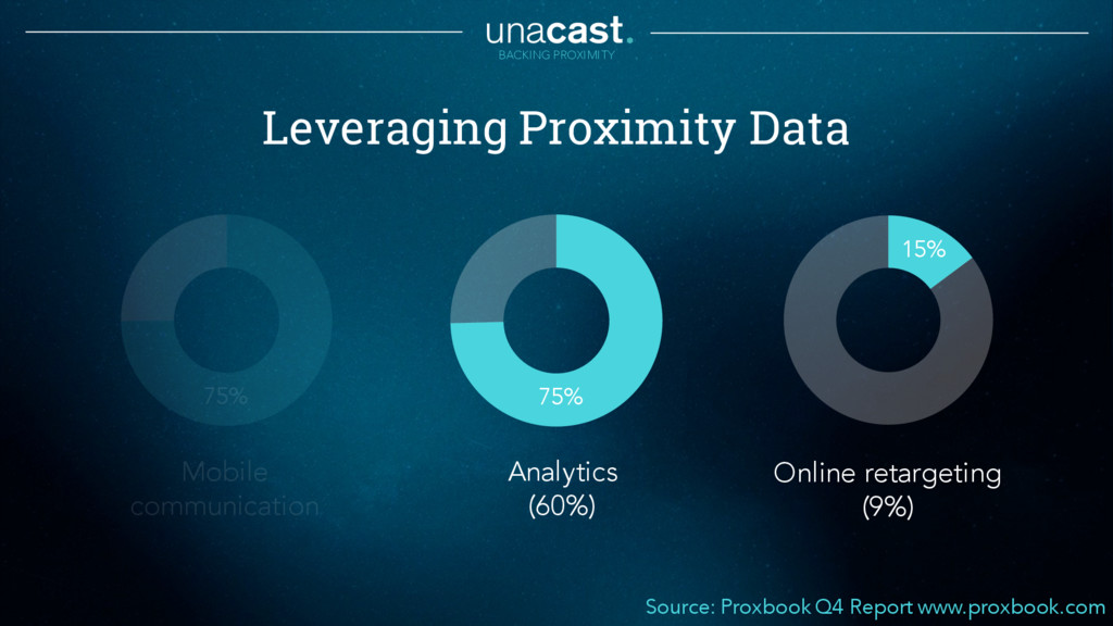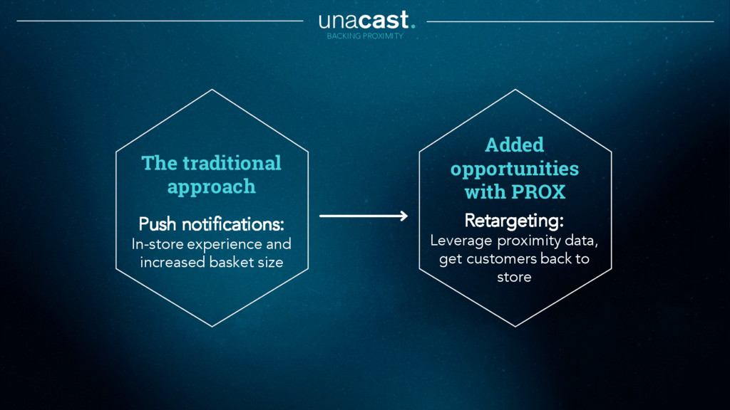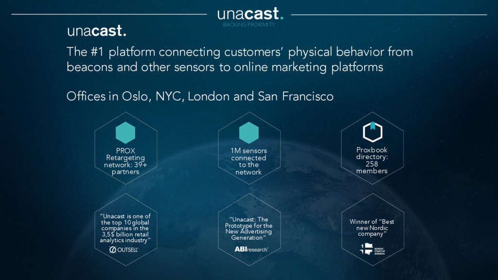 the 3,5$ billion retail analytics industry” “Unacast: The Prototype for the New Advertising Generation” Winner of “Best new Nordic company” BACKING PROXIMITY The #1 platform connecting customers’ physical behavior from beacons and other sensors to online marketing platforms Offices in Oslo, NYC, London and San Francisco PROX Retargeting network: 39+ partners 1M sensors connected to the network Proxbook directory: 258 members