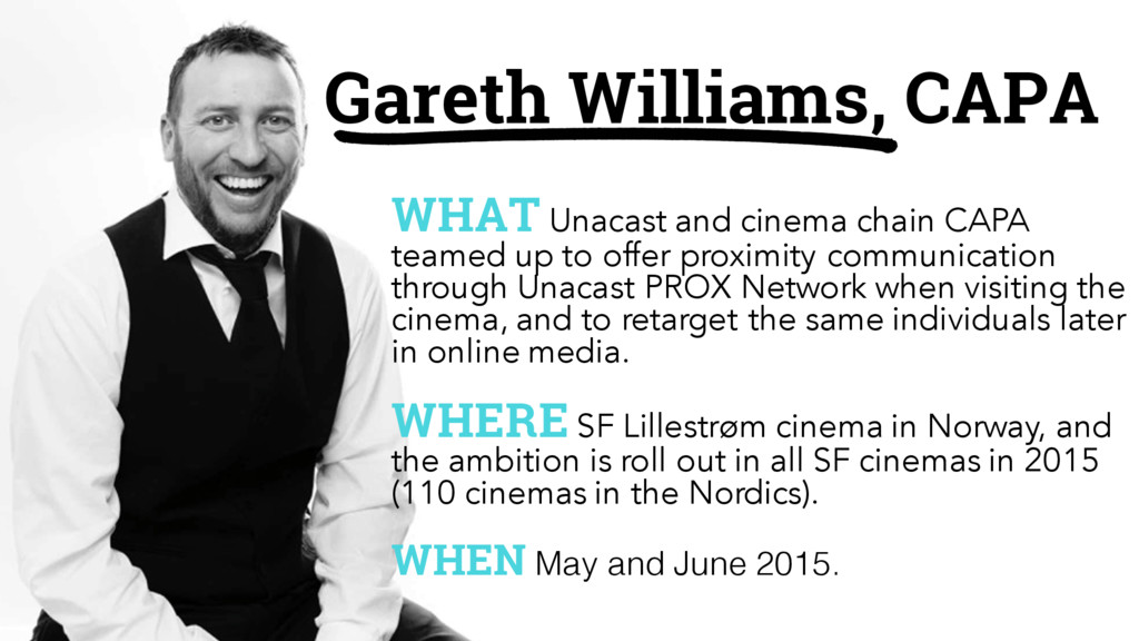 proximity communication through Unacast PROX Network when visiting the cinema, and to retarget the same individuals later in online media. WHERE SF Lillestrøm cinema in Norway, and the ambition is roll out in all SF cinemas in 2015 (110 cinemas in the Nordics). WHEN May and June 2015. Gareth Williams, CAPA