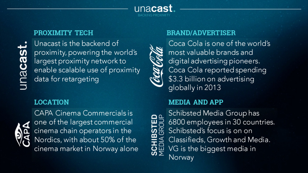 proximity network to enable scalable use of proximity data for retargeting Coca Cola is one of the world’s most valuable brands and digital advertising pioneers. Coca Cola reported spending $3.3 billion on advertising globally in 2013 CAPA Cinema Commercials is one of the largest commercial cinema chain operators in the Nordics, with about 50% of the cinema market in Norway alone Schibsted Media Group has 6800 employees in 30 countries. Schibsted’s focus is on on Classifieds, Growth and Media. VG is the biggest media in Norway PROXIMITY TECH BRAND/ADVERTISER LOCATION MEDIA AND APP BACKING PROXIMITY