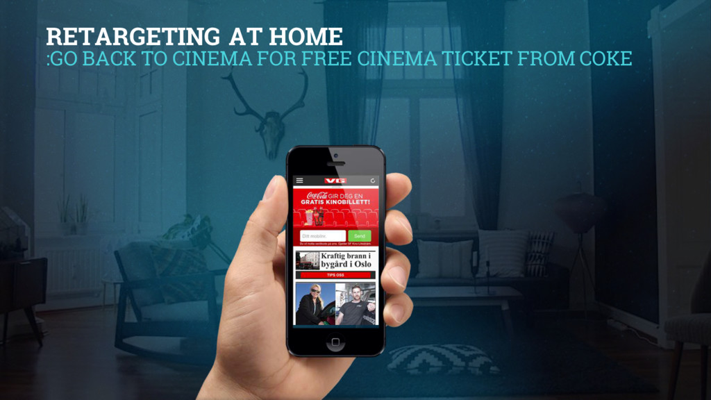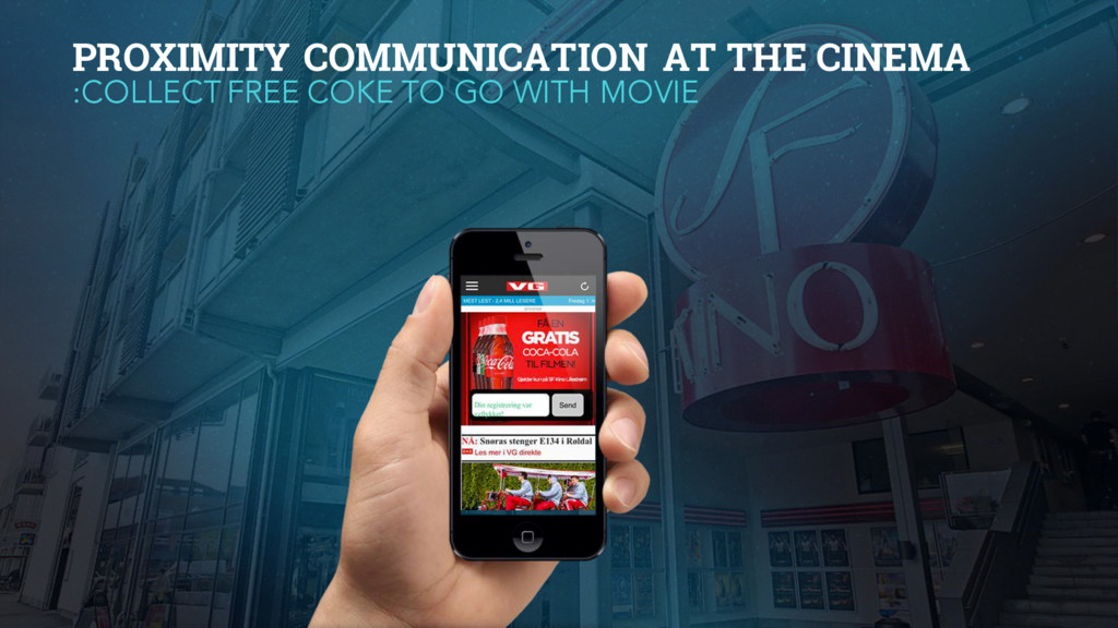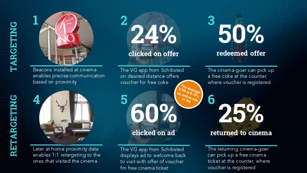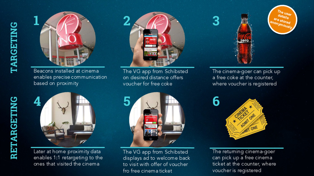 The VG app from Schibsted on desired distance offers voucher for free coke The cinema-goer can pick up a free coke at the counter, where voucher is registered Later at home proximity data enables 1:1 retargeting to the ones that visited the cinema The VG app from Schibsted displays ad to welcome back to visit with offer of voucher fro free cinema ticket The returning cinema-goer can pick up a free cinema ticket at the counter, where voucher is registered The user details are stored anonymously 1 2 3 4 5 6 TARGETING RETARGETING