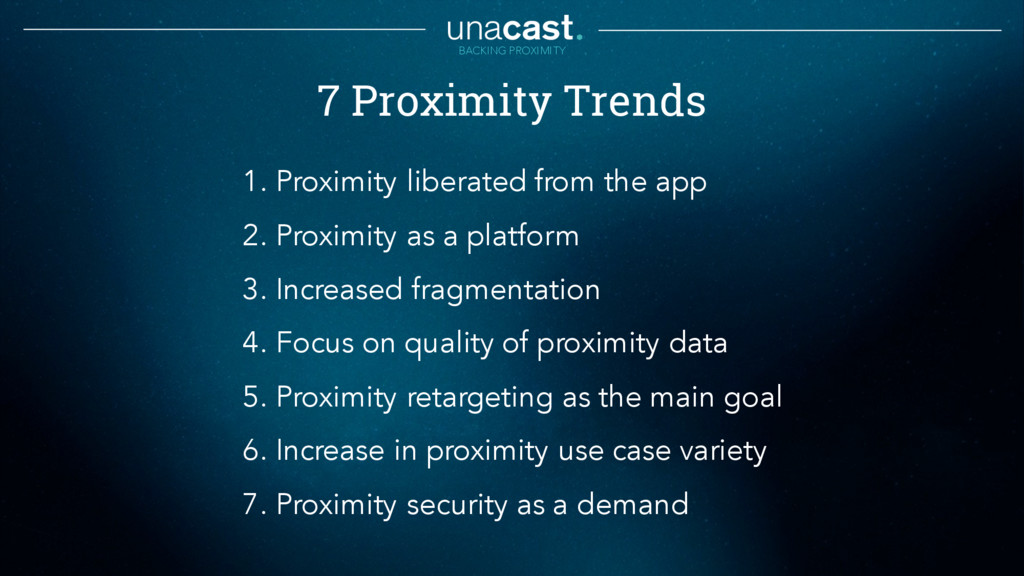 app 2. Proximity as a platform 3. Increased fragmentation 4. Focus on quality of proximity data 5. Proximity retargeting as the main goal 6. Increase in proximity use case variety 7. Proximity security as a demand