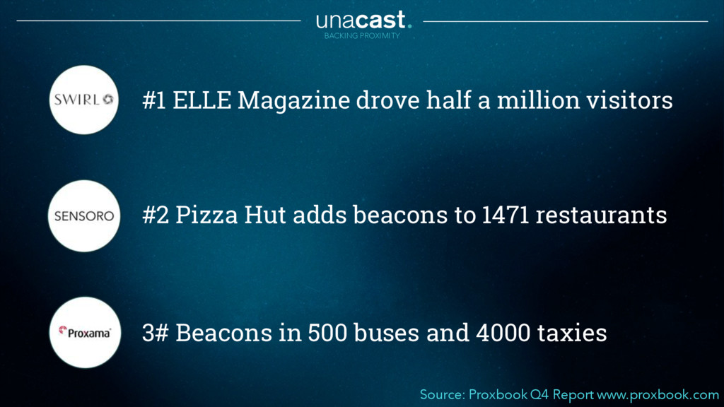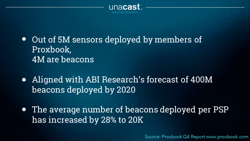 Proxbook, 4M are beacons Aligned with ABI Research’s forecast of 400M beacons deployed by 2020 The average number of beacons deployed per PSP has increased by 28% to 20K Source: Proxbook Q4 Report www.proxbook.com