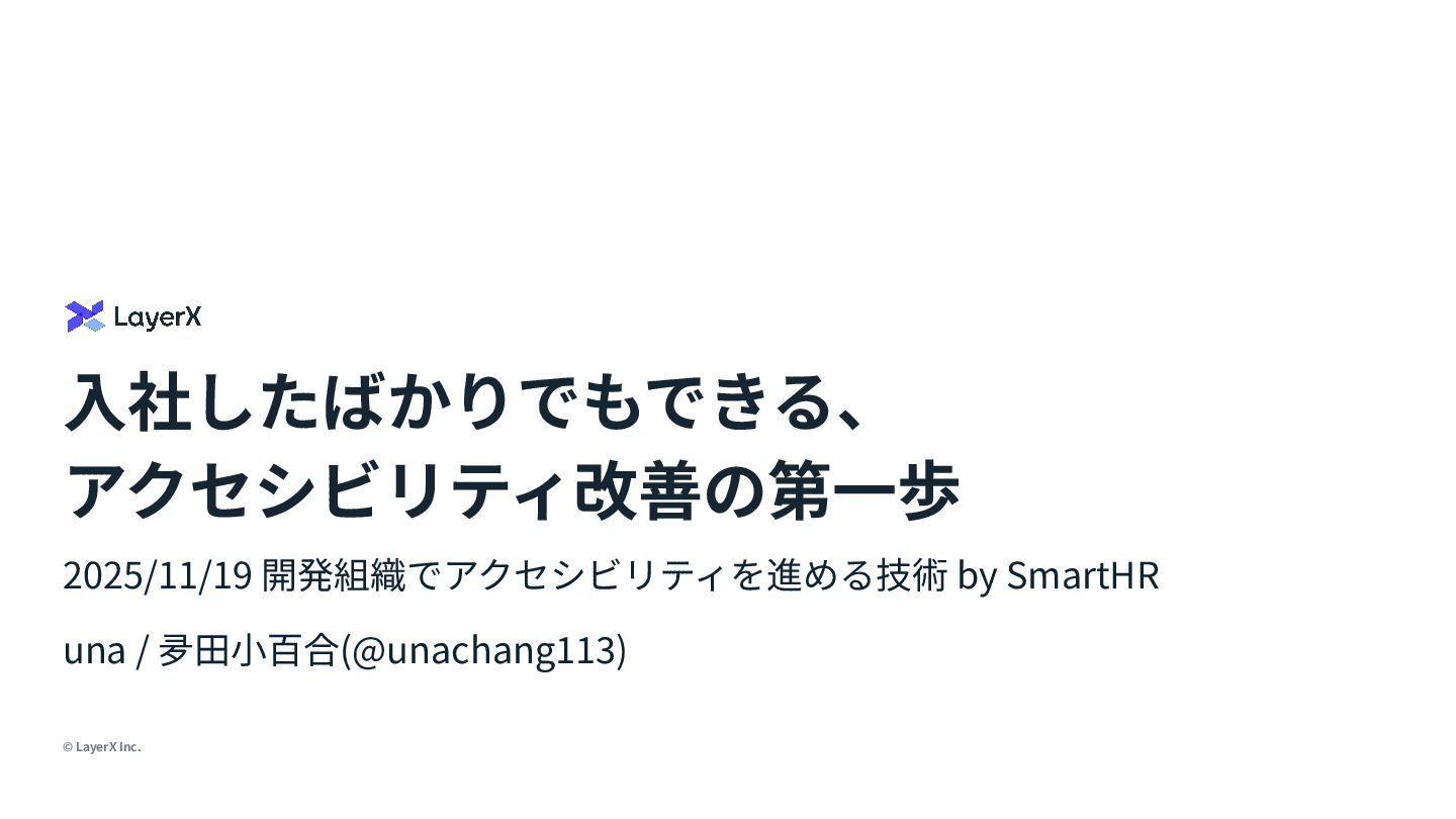 © LayerX Inc. ⼊社したばかりでもできる、 アクセシビリティ改善の第⼀歩 2025/11/19 開発組織でアクセシビリティを進める技術 by SmartHR una