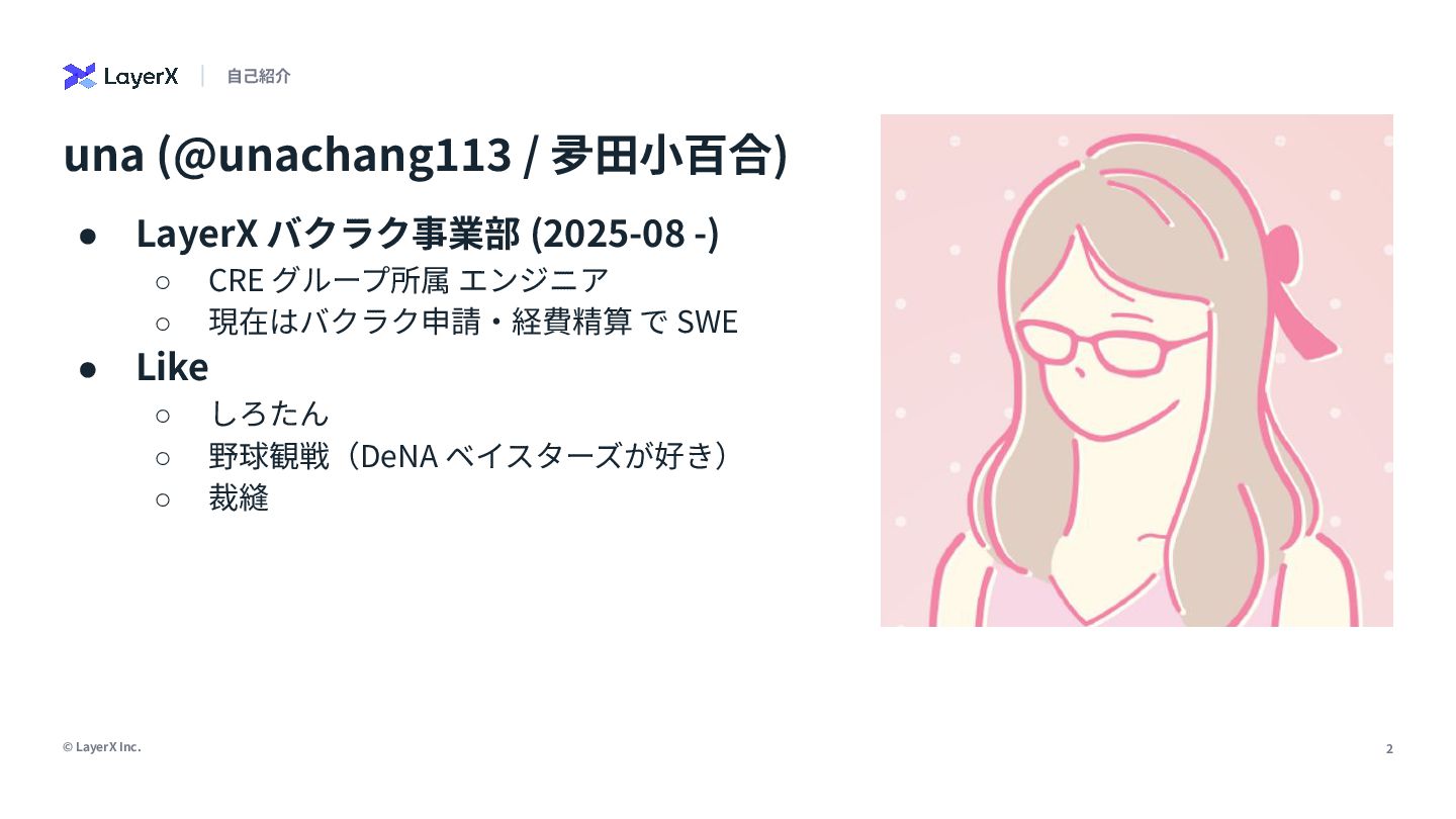 CRE グループ所属 エンジニア ◦ 現在はバクラク申請‧経費精算 で SWE • Like ◦ しろたん ◦ 野球観戦(DeNA ベイスターズが好き) ◦ 裁縫 una (@unachang113 / 夛⽥⼩百合) ⾃⼰紹介
