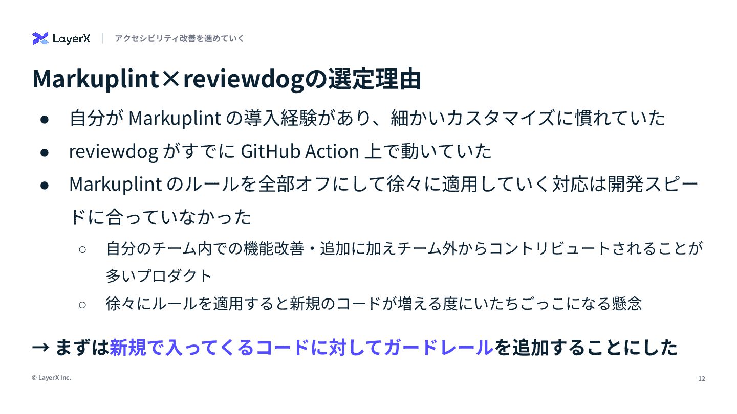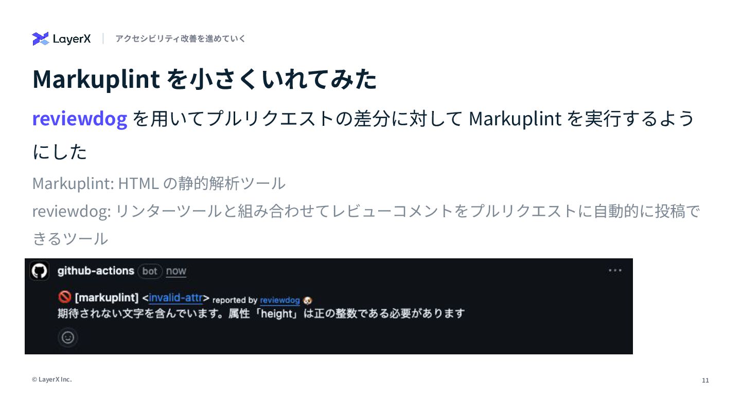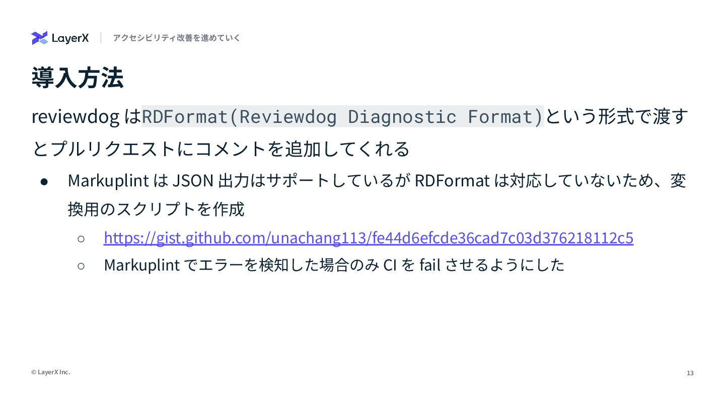 © LayerX Inc. 12 • ⾃分が Markuplint の導⼊経験があり、細かいカスタマイズに慣れていた • reviewdog