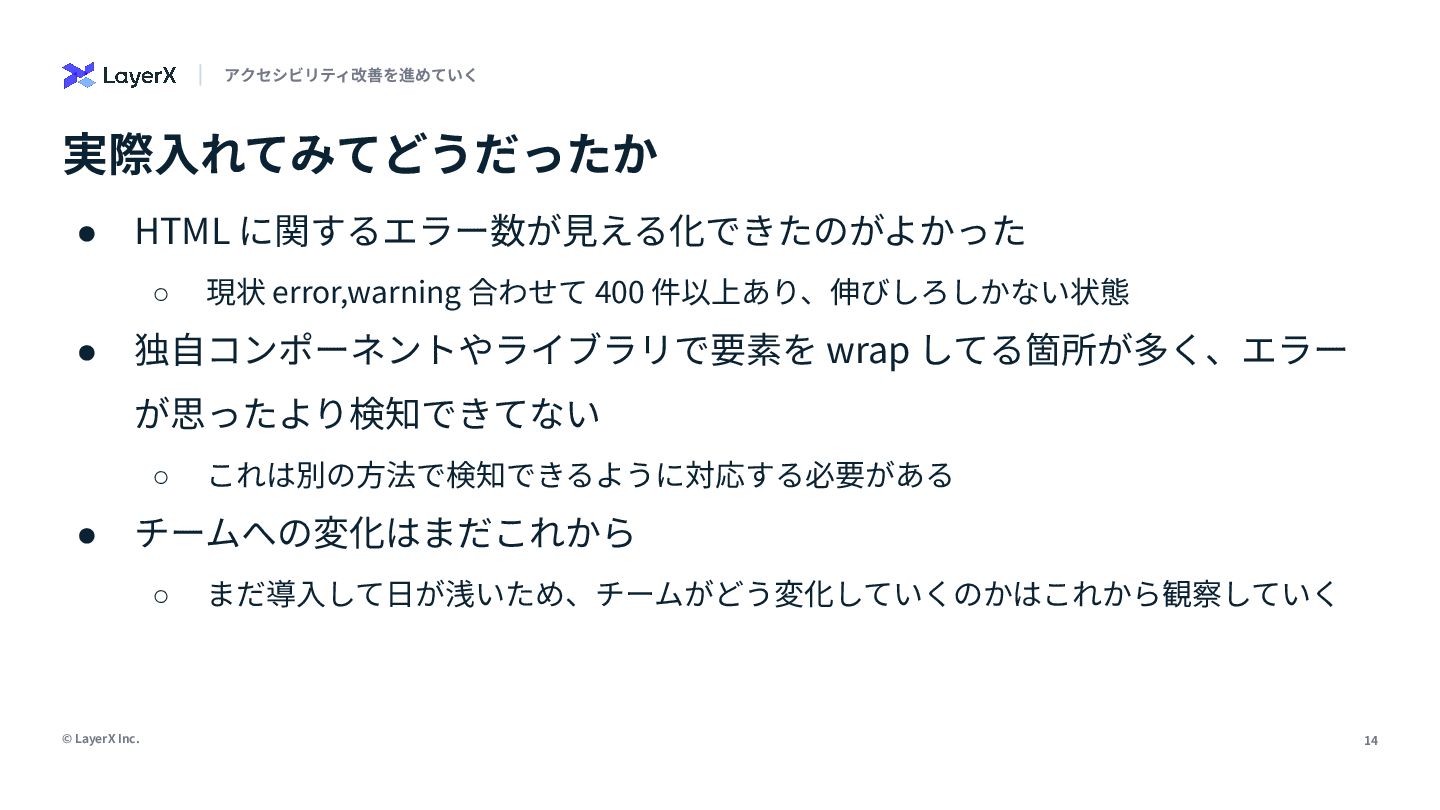 © LayerX Inc. 14 • HTML に関するエラー数が⾒える化できたのがよかった ◦ 現状 error,warning