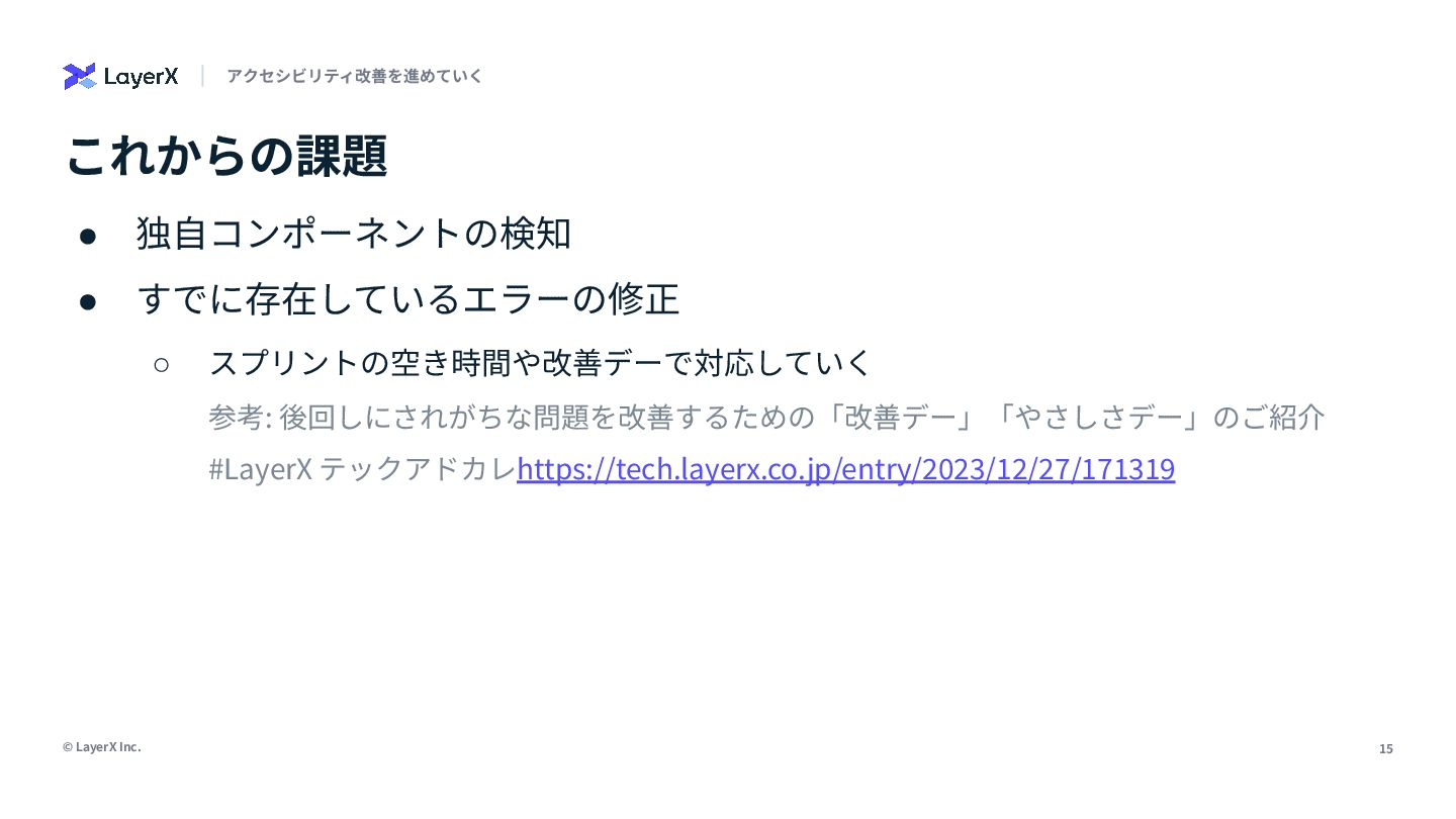 参考: 後回しにされがちな問題を改善するための「改善デー」「やさしさデー」のご紹介 #LayerX テックアドカレhttps://tech.layerx.co.jp/entry/2023/12/27/171319 これからの課題 アクセシビリティ改善を進めていく