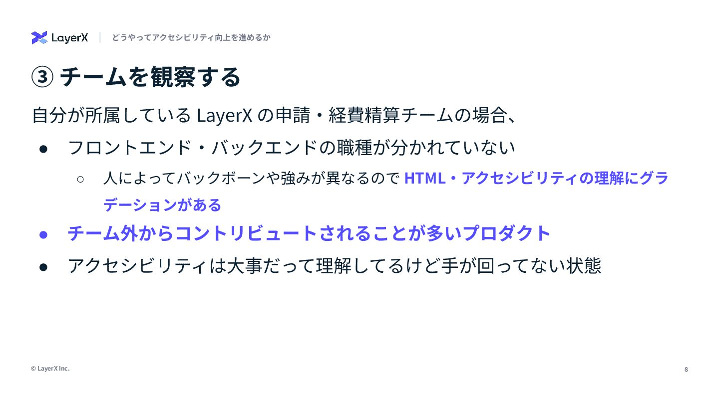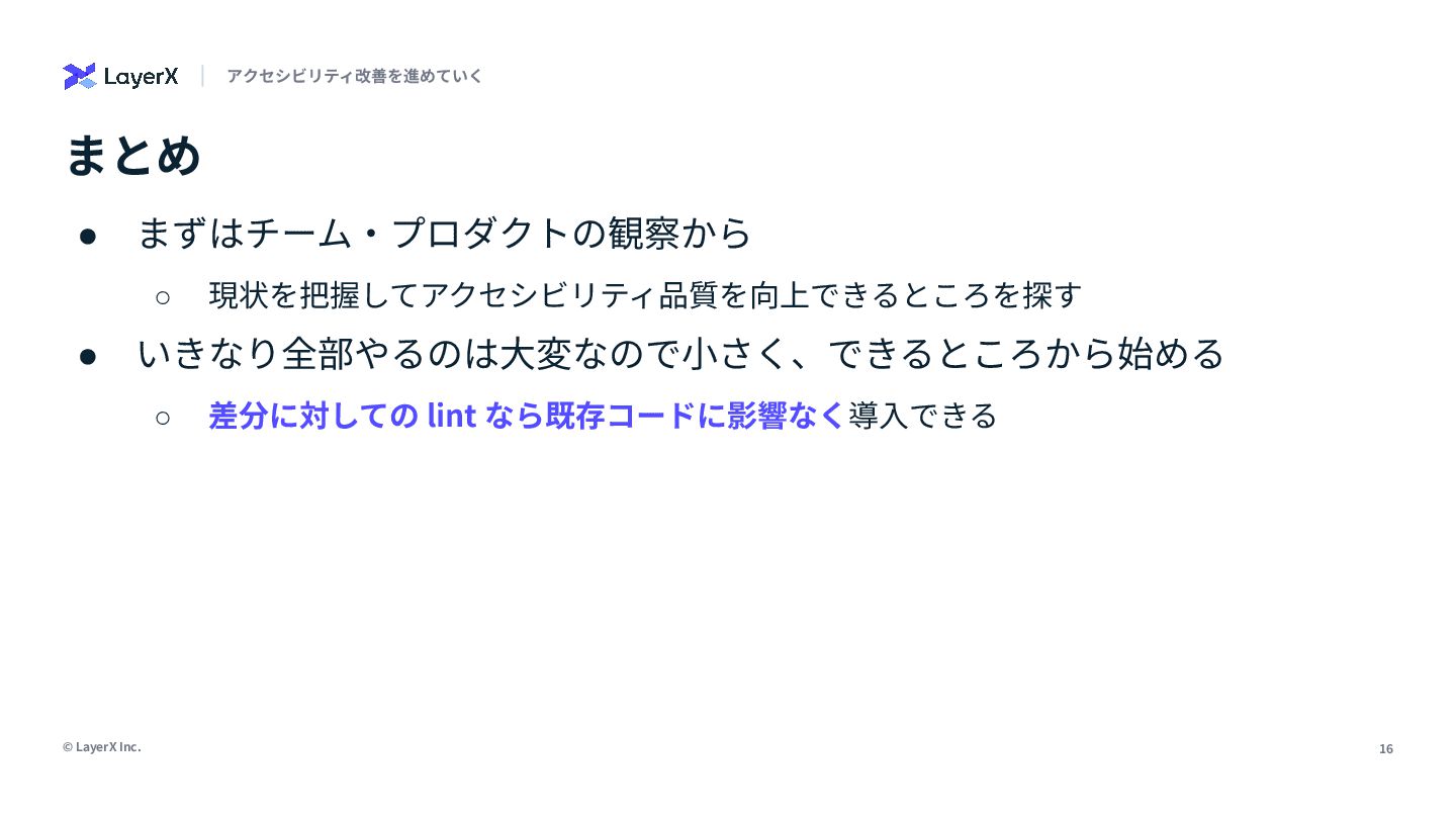 © LayerX Inc. 16 • まずはチーム‧プロダクトの観察から ◦ 現状を把握してアクセシビリティ品質を向上できるところを探す • いきなり全部やるのは⼤変なので⼩さく、できるところから始める