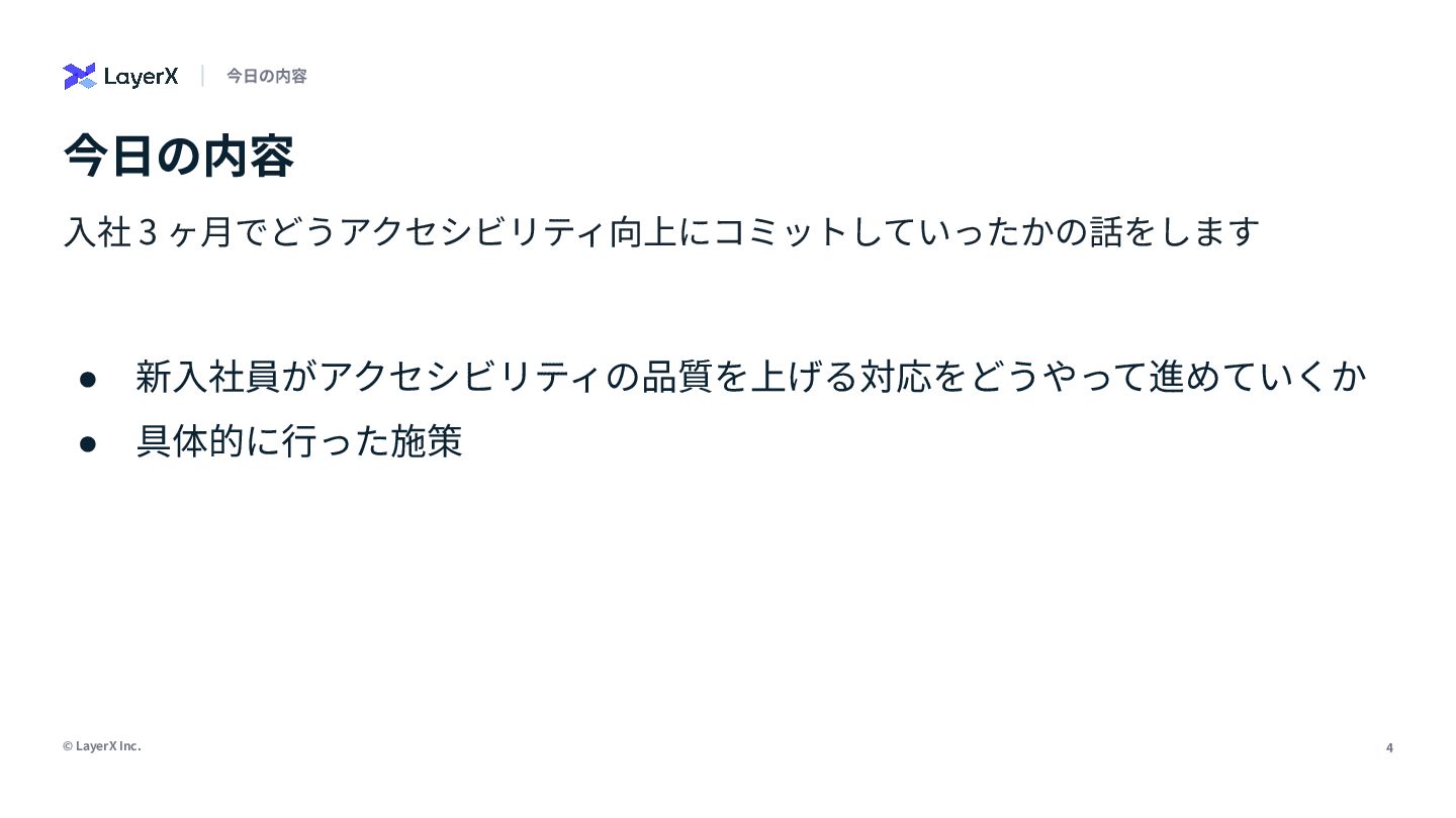 © LayerX Inc. 4 ⼊社 3 ヶ⽉でどうアクセシビリティ向上にコミットしていったかの話をします • 新⼊社員がアクセシビリティの品質を上げる対応をどうやって進めていくか •