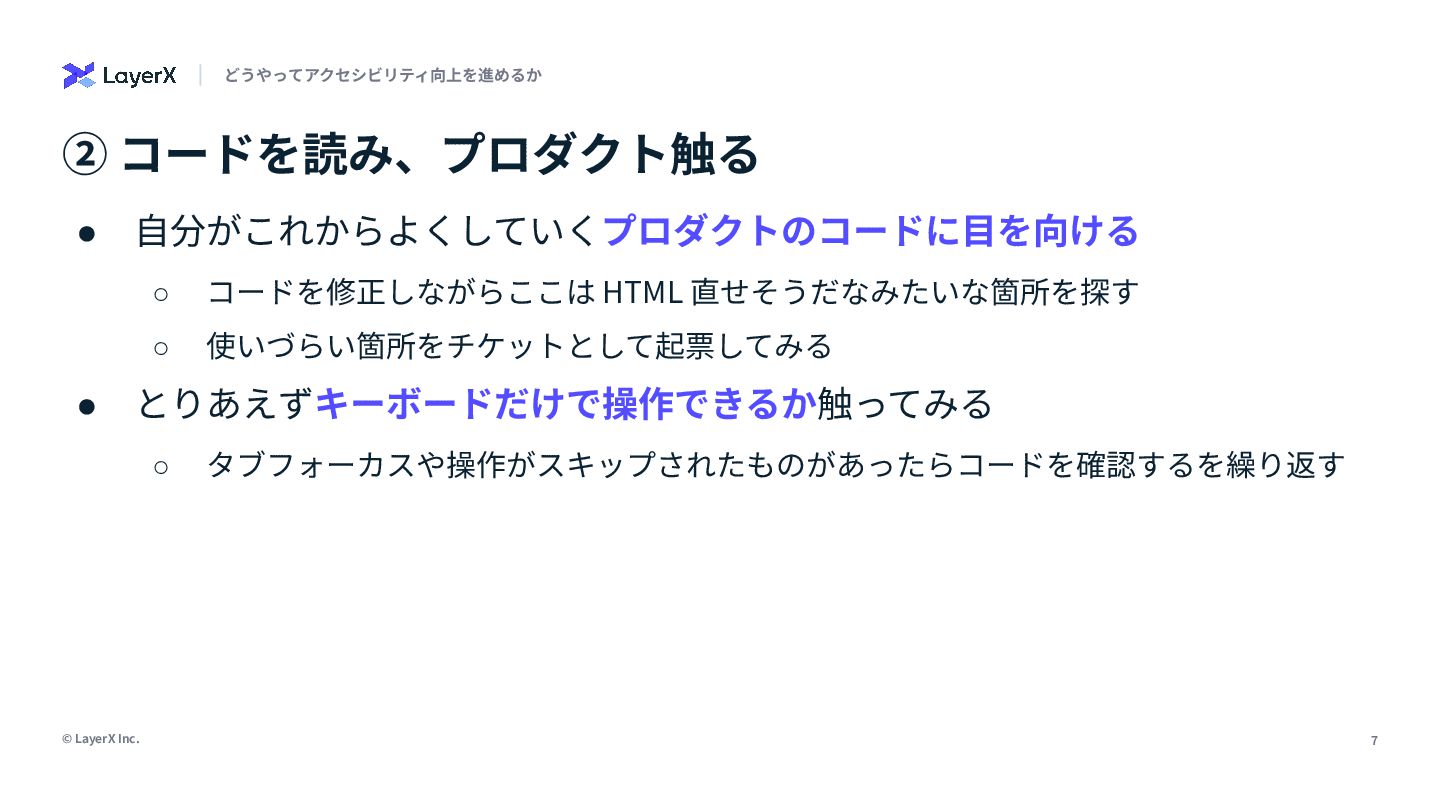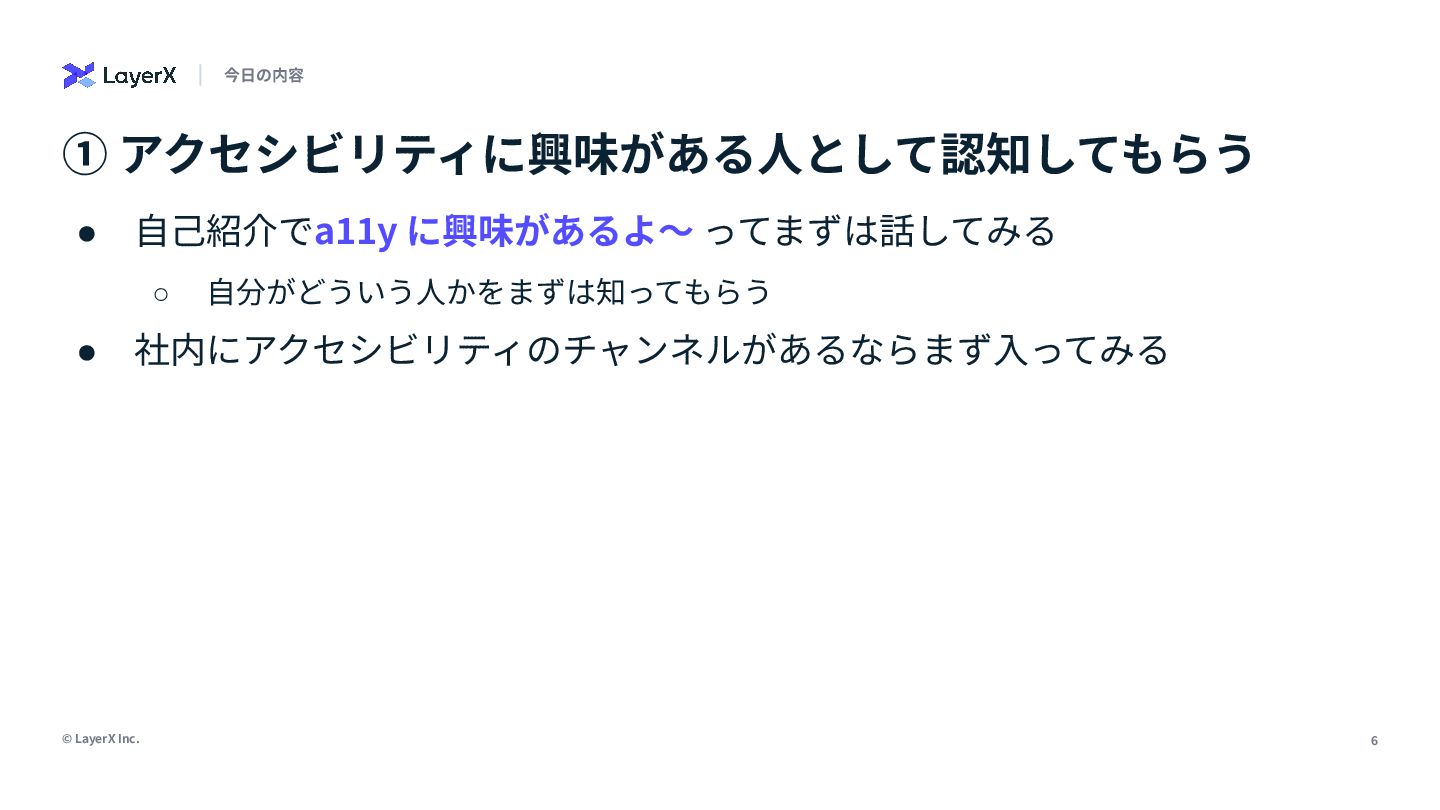 © LayerX Inc. 6 • ⾃⼰紹介でa11y に興味があるよ〜 ってまずは話してみる ◦ ⾃分がどういう⼈かをまずは知ってもらう